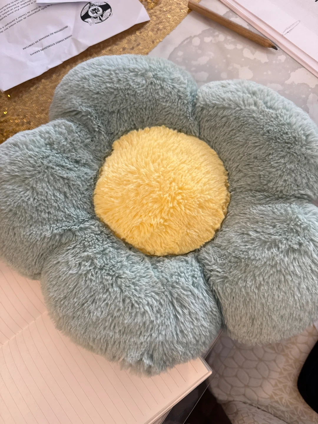 Joli coussin décoratif en forme de fleur, parfait pour ajouter une touche de douceur à votre intérieur! La couleur est un mélange de bleu-gris et jaune, très tendance