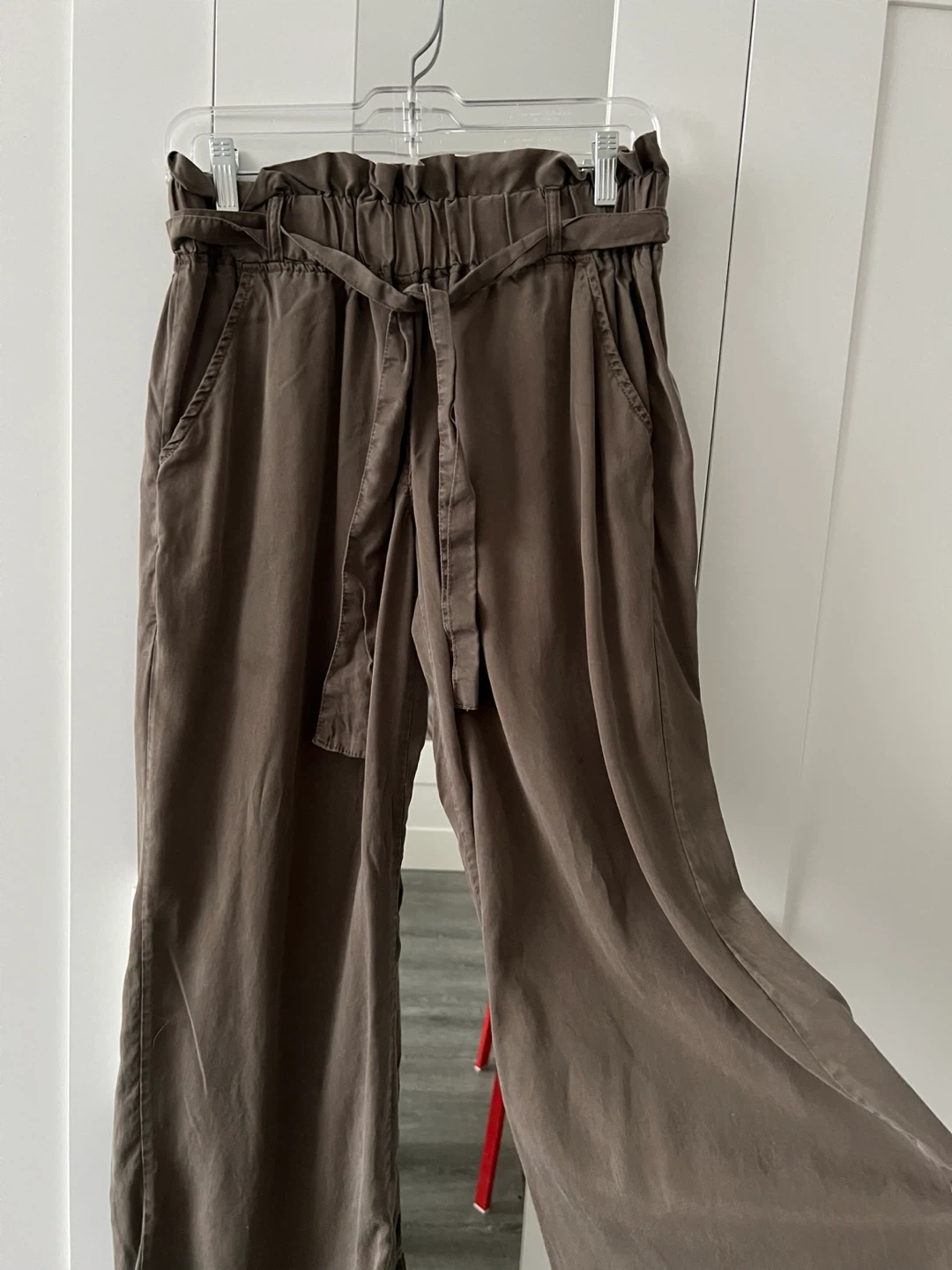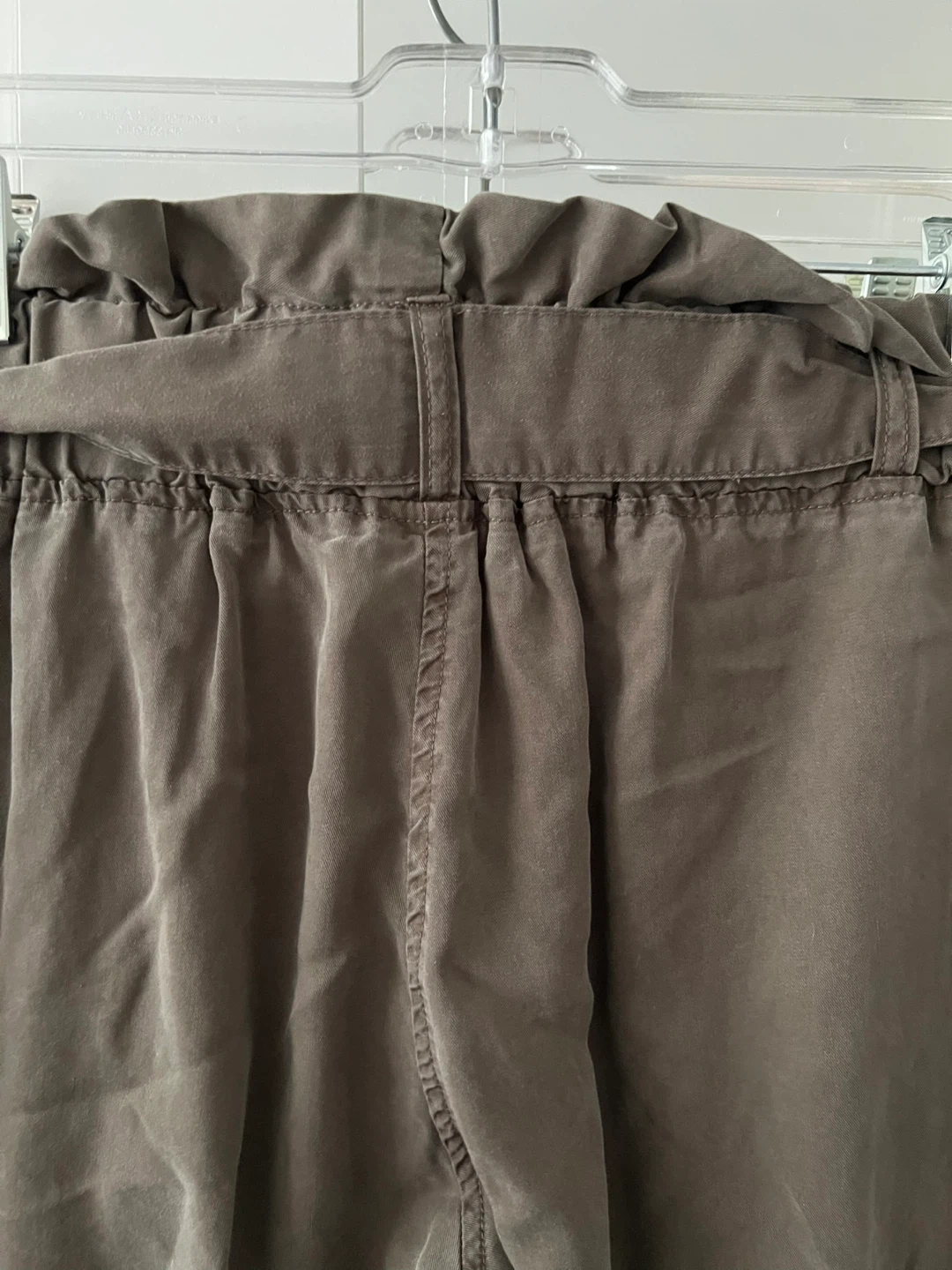 Olive green paper bag style pants. They are a size S-M and in great condition, very soft and flowy. These pants are super comfy and stylish, perfect for a casual day out or dressing up for a night out