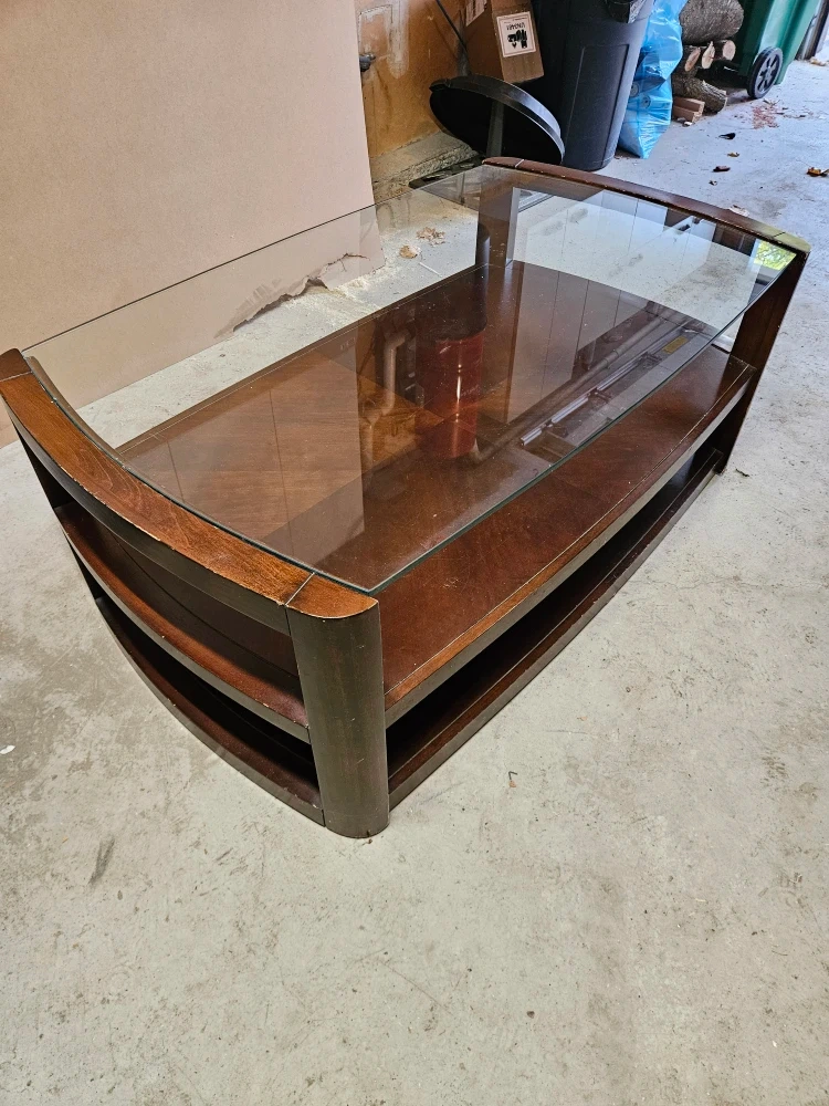Selling a coffee table with a glass top and a sturdy wood frame. It's in good condition and would be a great addition to any living room! It's approximately 48 inches long and 26 inches wide. and 19 inches tall