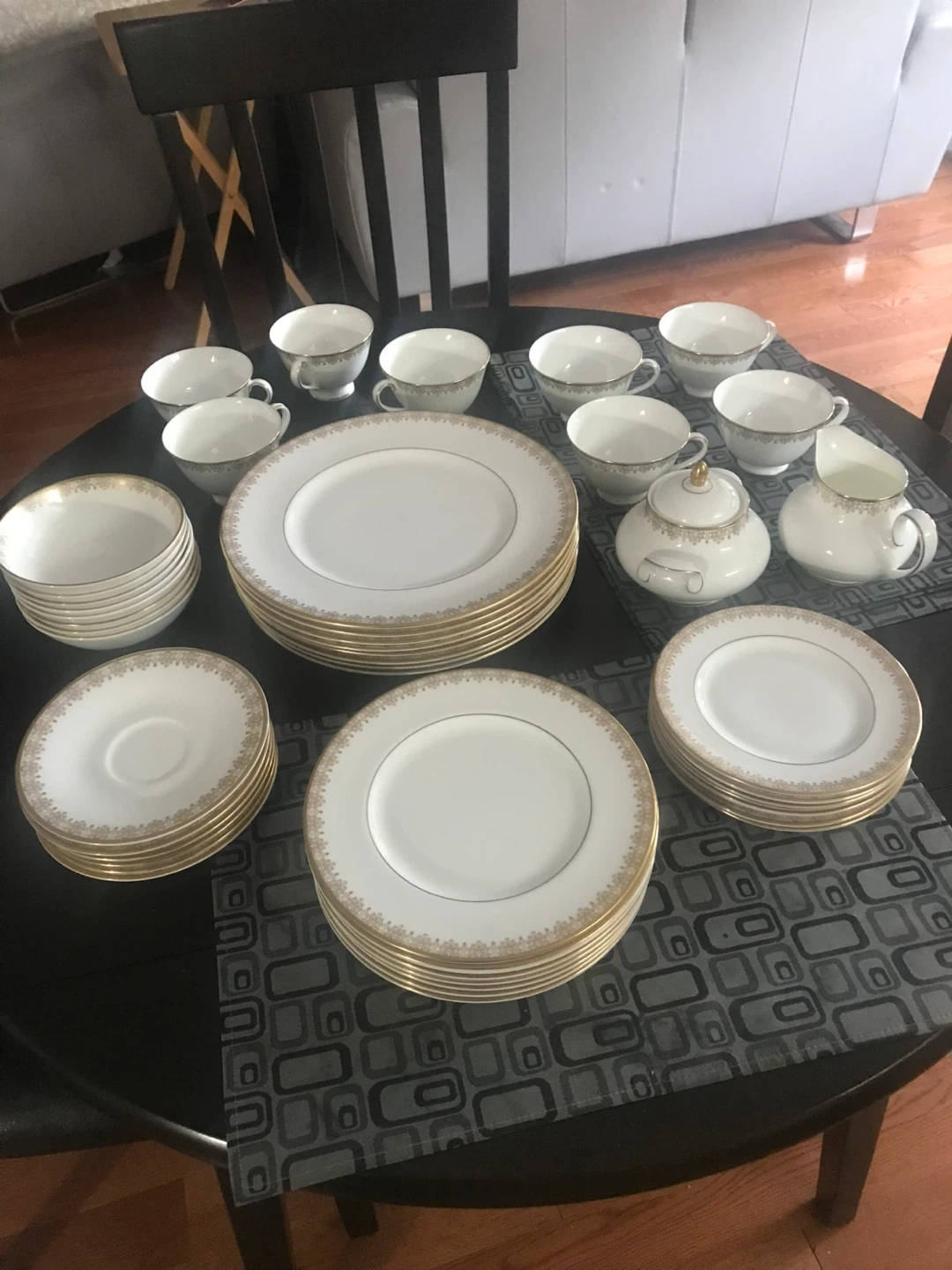 10Selling a fine china dinnerware set. It includes plates, saucers, cups, a sugar bowl, and a creamer. The set is white with gold trim and in great condition. Perfect for special occasions or adding a touch of elegance to your everyday dining experience