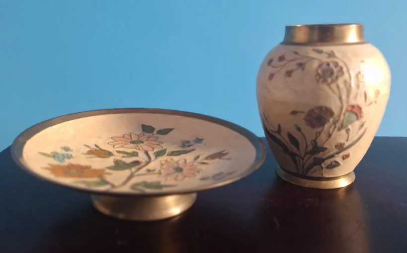 71Beautiful vase and plate set. Vintage solid brass with painted enamel. Made in India. They would make a lovely addition to any home. plate 6 inches diameter vase 5 inches price for a set