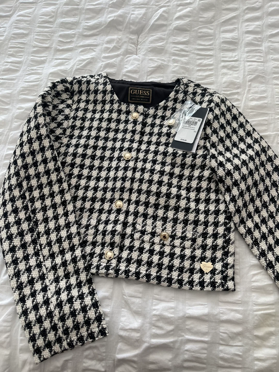This is a brand new Guess Pied De Poule blazer, size 10, with the tags still on! It's a black and white blazer with gold buttons. It's very delicate and should be handled with care. Originally priced at $79.00!