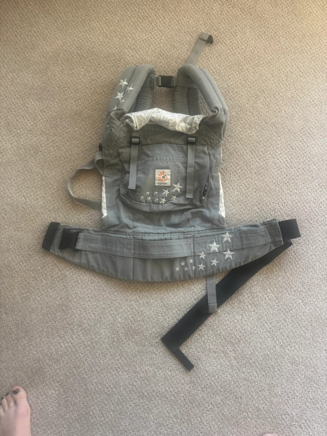 Selling a gently used Ergobaby baby carrier in a lovely grey colour with a star pattern. It's in great condition and ready for a new little one! This carrier is super comfy for both parent and baby, making outings a breeze. Perfect for keeping your baby close and secure while you're on the go