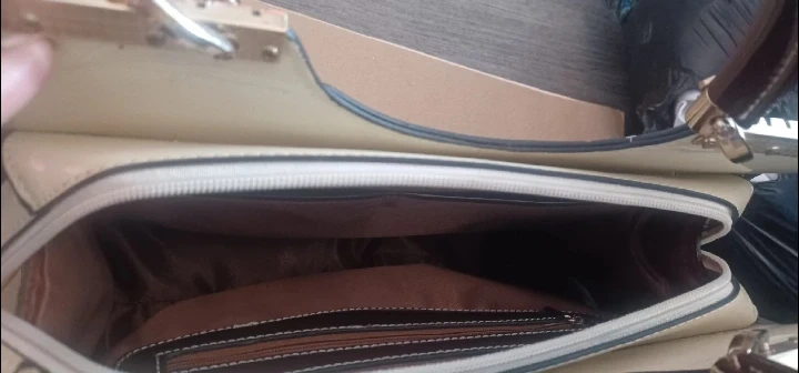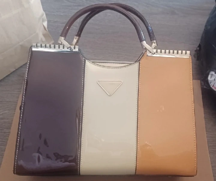 Here's a stylish colour block (brown, tan, mustard yellow) handbag featuring a patent leather finish. It has a unique handle design and is in great condition. Perfect for adding a pop of colour to your outfit! 12.5"W x 9"