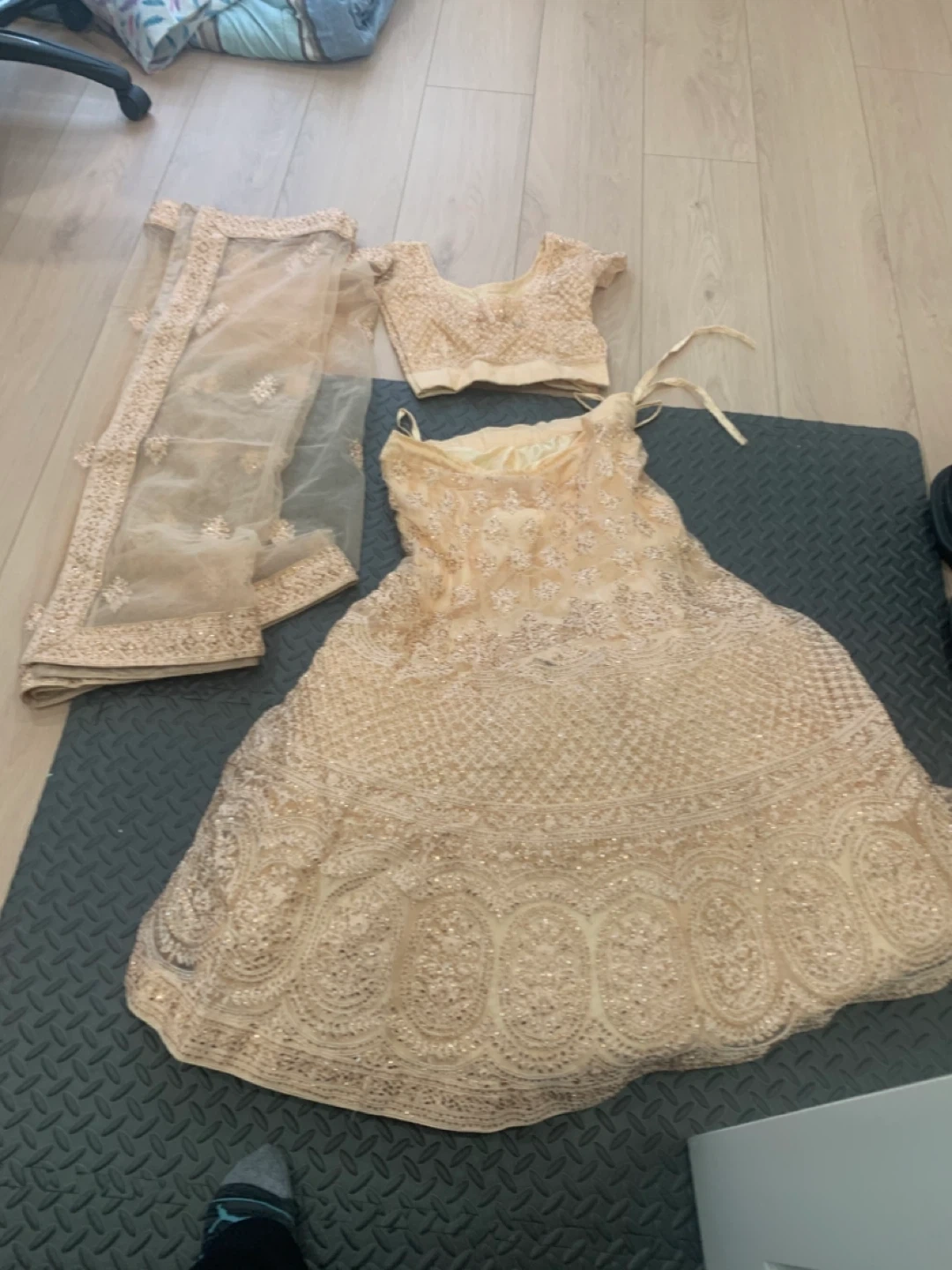 Selling a beautiful beige lehenga choli set. This traditional Indian outfit is perfect for weddings or special occasions. It includes a skirt (lehenga), a blouse (choli), and a scarf (dupatta). The fabric is intricately designed, adding a touch of elegance to the ensemble