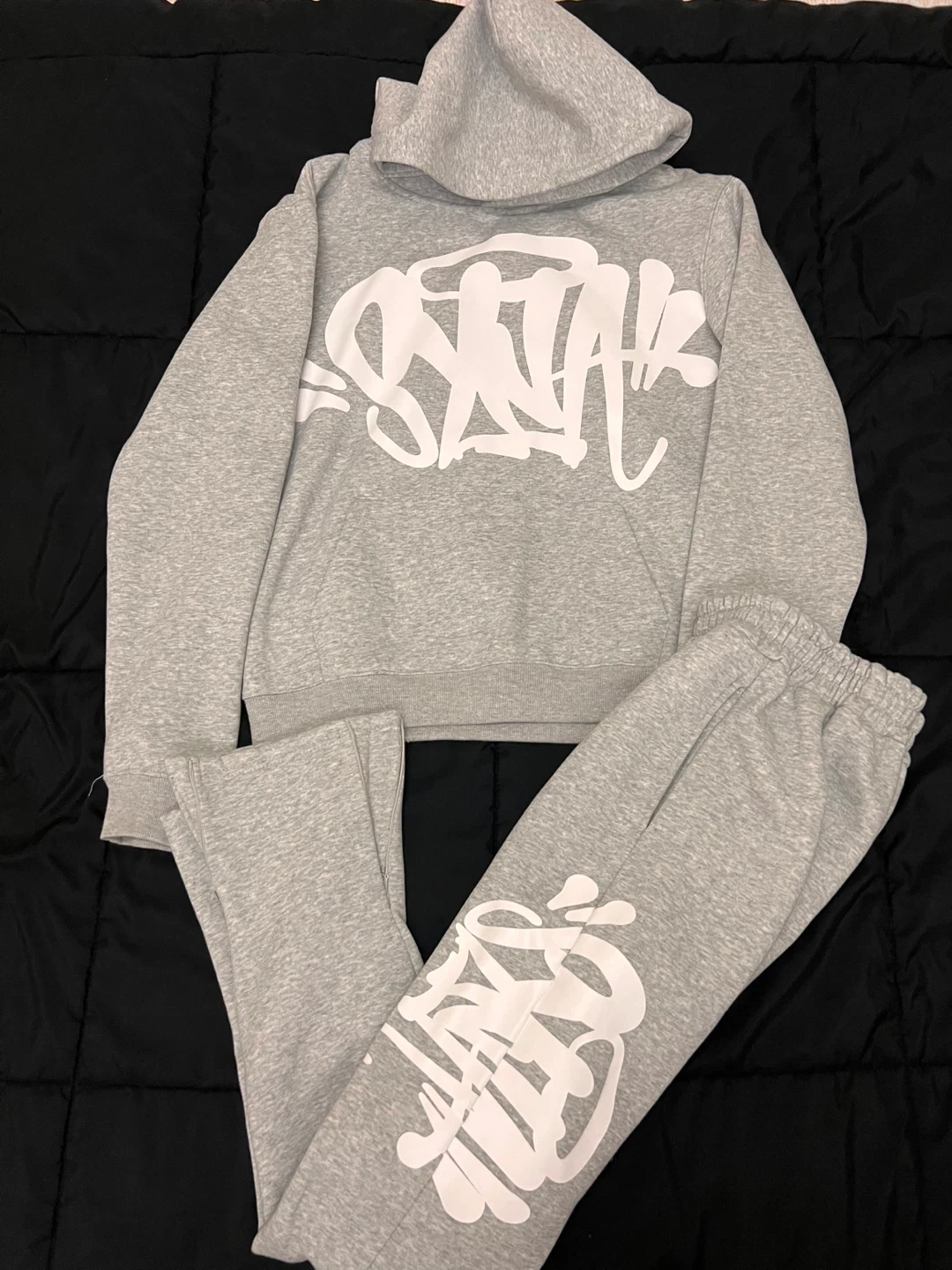 15Selling a hoodie and sweatpants set from SYNA! It's a light gray colour with the SNYA logo in white. Great for lounging or casual wear