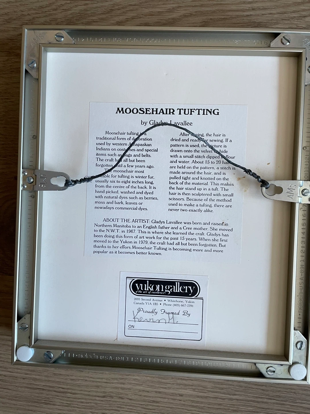 Looking to rehome this beautiful piece of moosehair tufting art by Gladys Lavallee. It's framed by Yukon Gallery and ready to hang! A unique piece of Canadian Indigenous art for your home