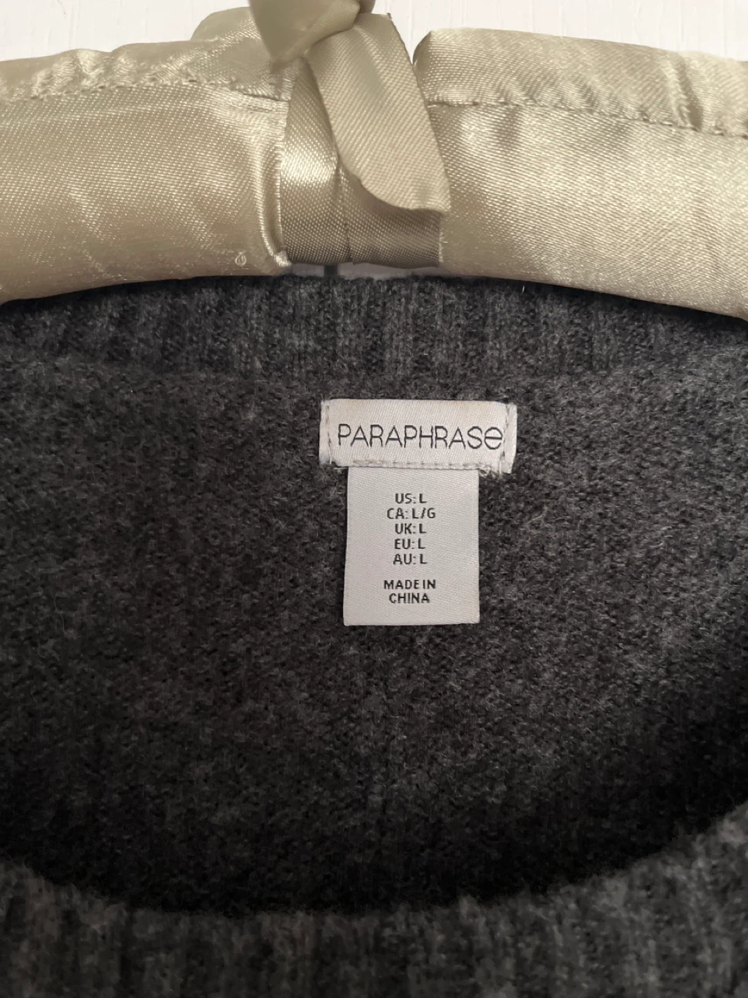 Paraphrase sweater dress! It's a lovely dark gray colour and a size large. The material is a blend of 55% cotton, 23% polyester, 20% nylon, and 2% spandex for a comfortable fit. It also has two handy pockets!