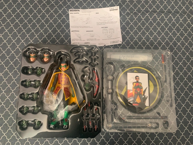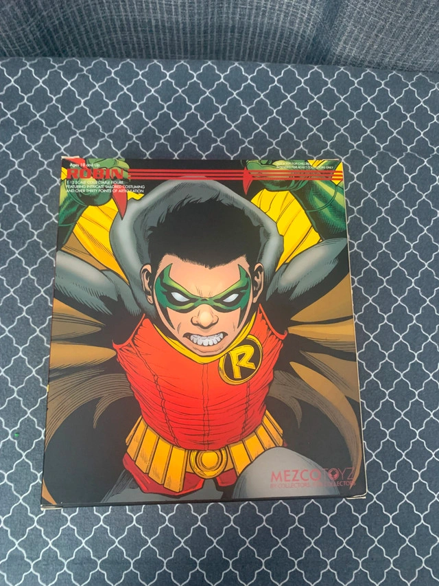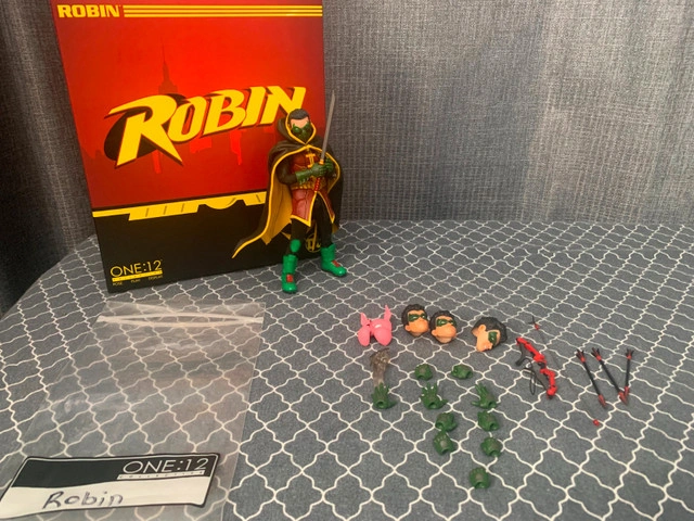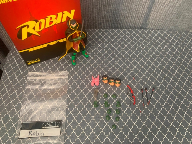 Hello, I'm selling an open box Mezco Robin (modified). It has been modified to reduce height, and the main head sculpt is more size appropriate. Accessories are incomplete, but there are no damages. $150 for the figure. I am flexible in price and open to and encourage buying multiple items for increased savings. I am not looking for any trades currently. Please inquire if you have questions and or want further details. Note: what you see in the pictures is what you get.