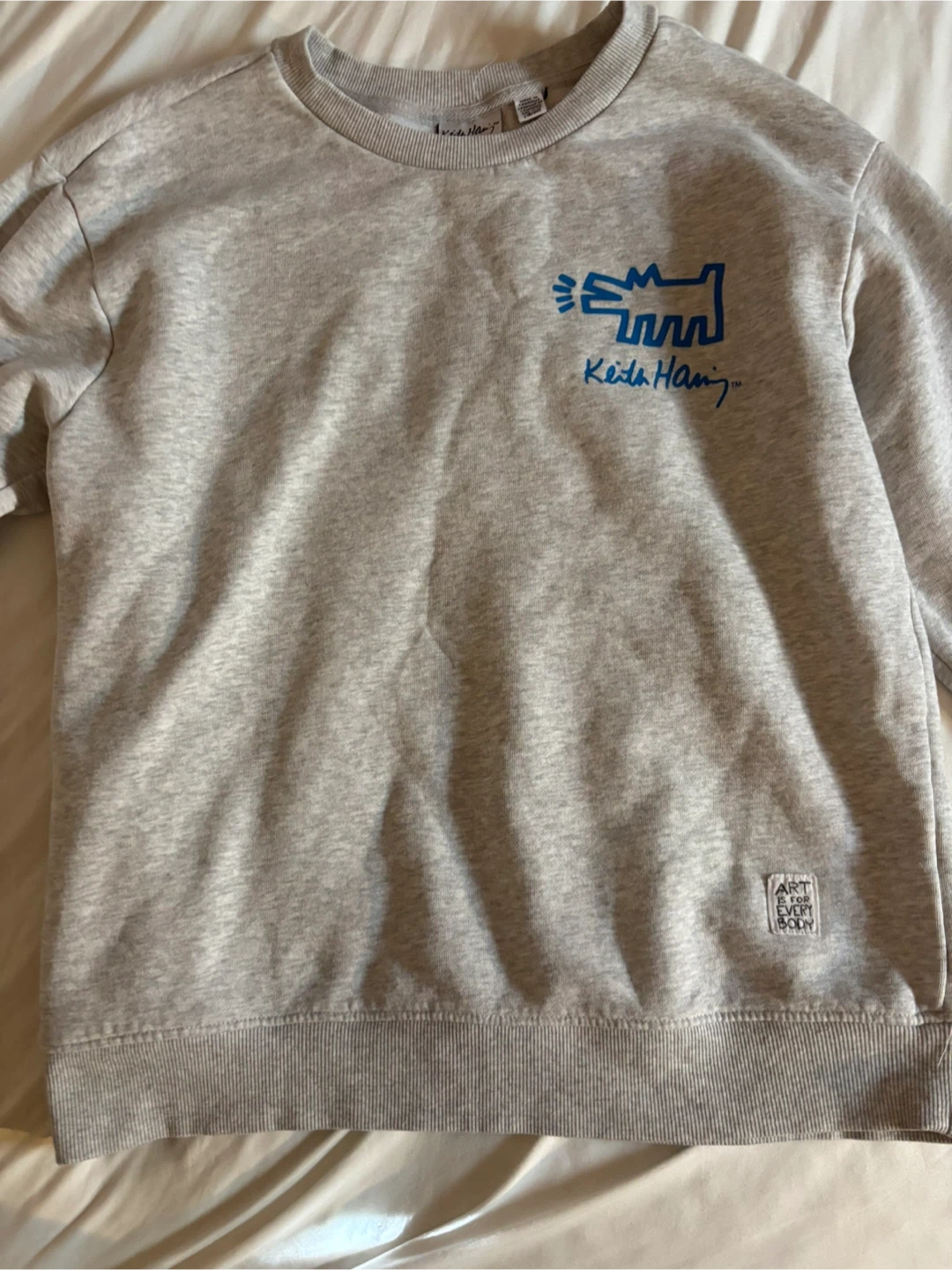 Selling a Keith Haring sweatshirt in size CAN/TG (18/20). It's a light grey colour with the classic Keith Haring dog design in blue. A super cool and comfy sweatshirt!