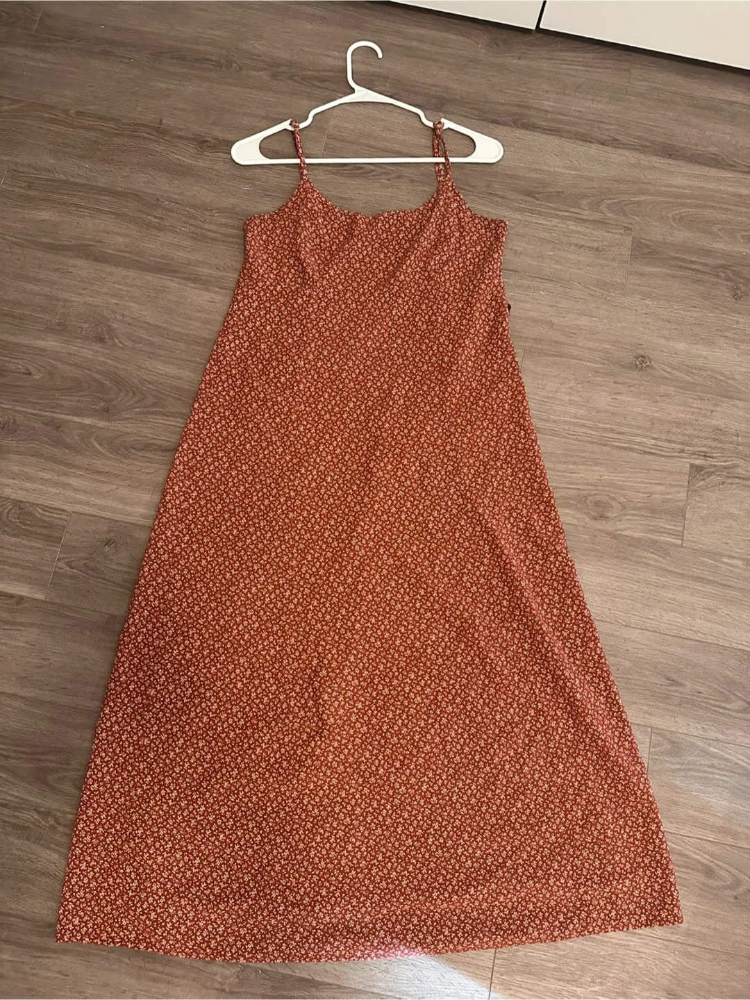 A lovely floral print sundress in a reddish-brown hue. It's perfect for summer days and has adjustable straps for a comfortable fit. This dress is in great condition and ready for a new home.