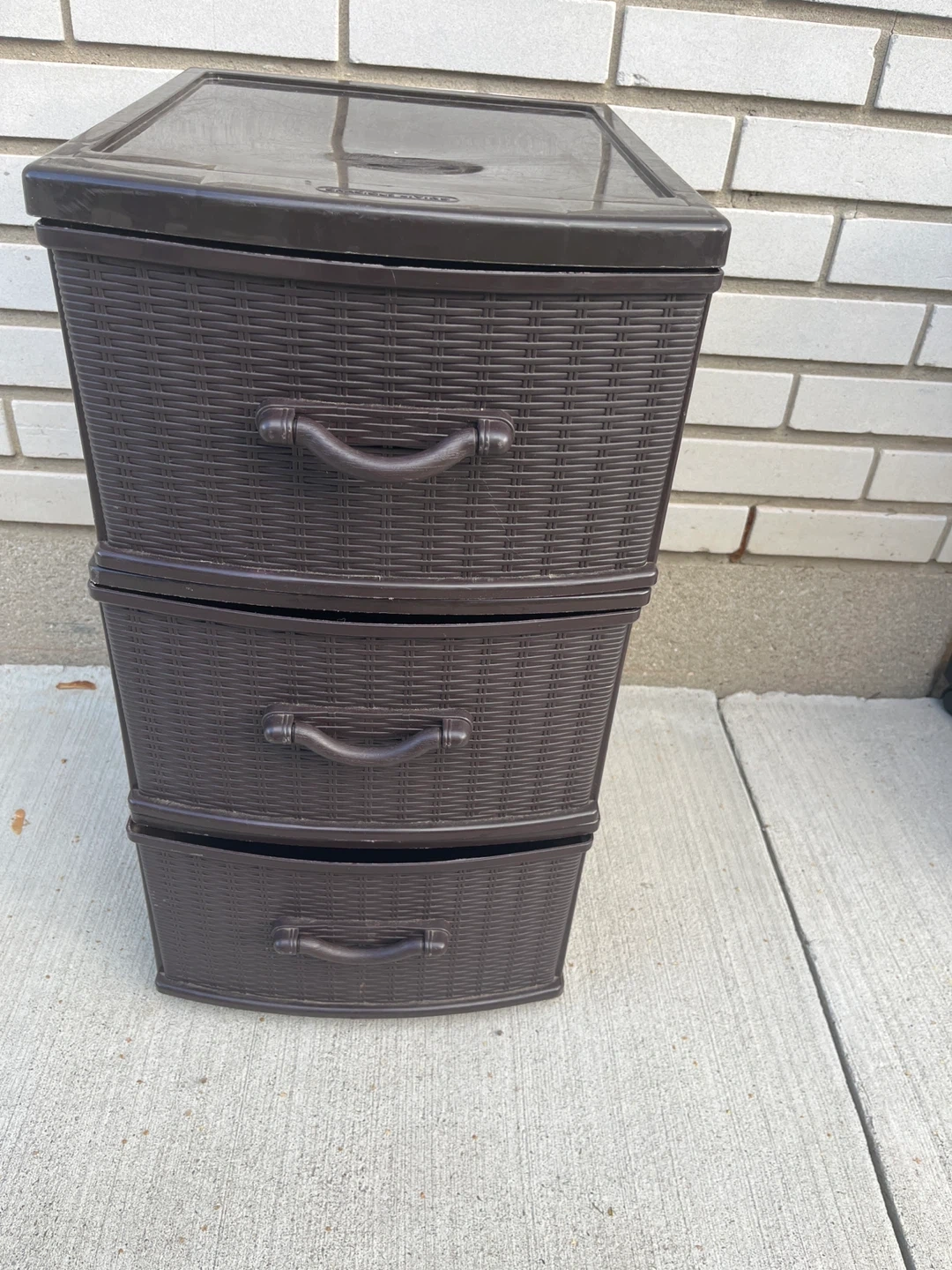 This is a brown storage unit with three drawers. It's perfect for organizing your belongings and keeping your space tidy. The drawers have a woven texture, adding a touch of style to its functionality