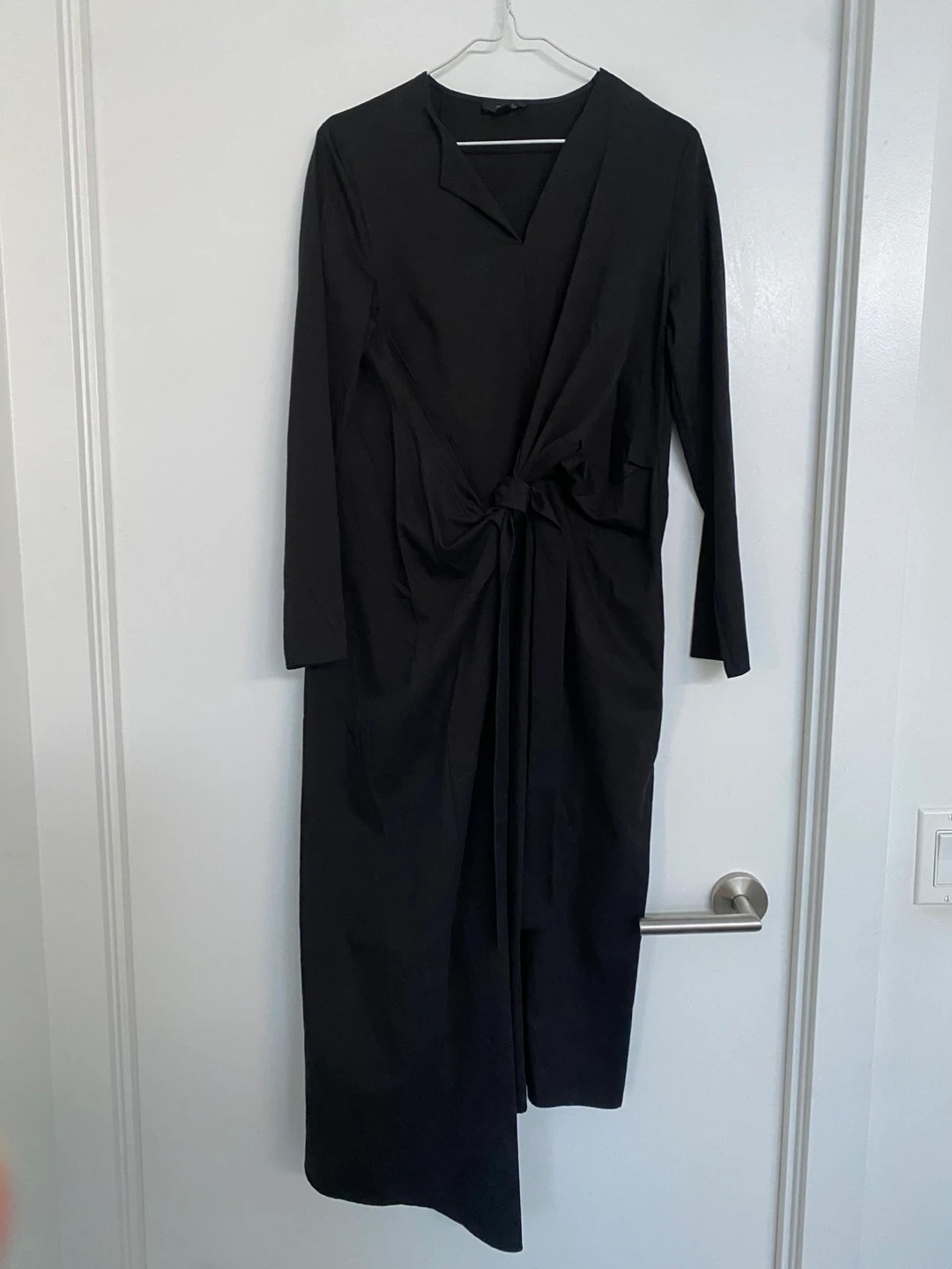 470Cos black dress in size 36. It's made from 67% cotton and 33% lyocell, making it super comfortable and breathable. The dress features a unique tie detail at the waist, adding a touch of elegance to your look. Perfect for any occasion!