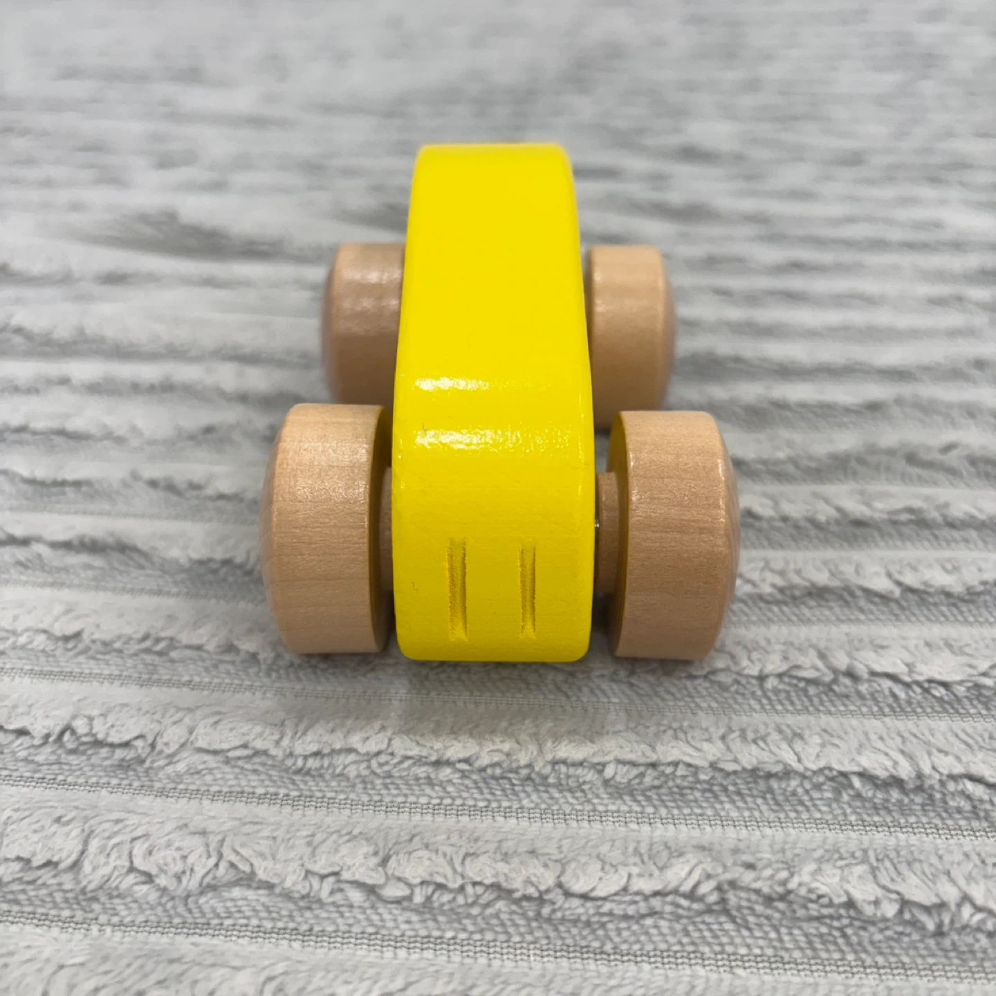Here's a cute yellow wooden push along car toy by Hape! It's in great condition and ready for a new home. Perfect for little hands to grasp and push around