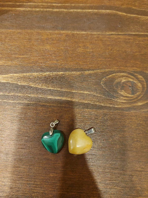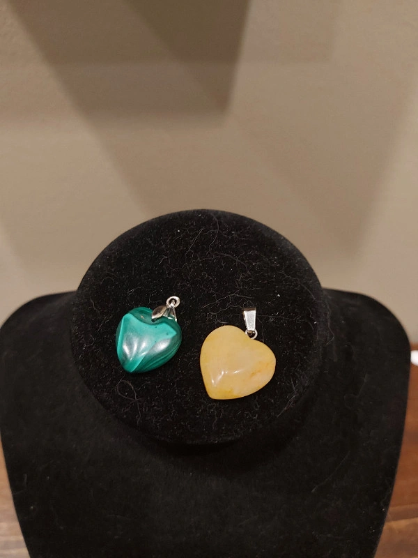 Beautiful Malachite and Yellow Calcite (Heart) pendants are being sold as a bundle and are brand new never worn. Each pendant is approximately 1" in length including the bail, see photos. Please note that all natural stones are different and can vary due to natural formations and irregularities within the crystal/stone itself. Color may appear different in the photo due to lighting. Pickup is in Dallas, Kamloops.