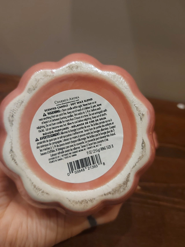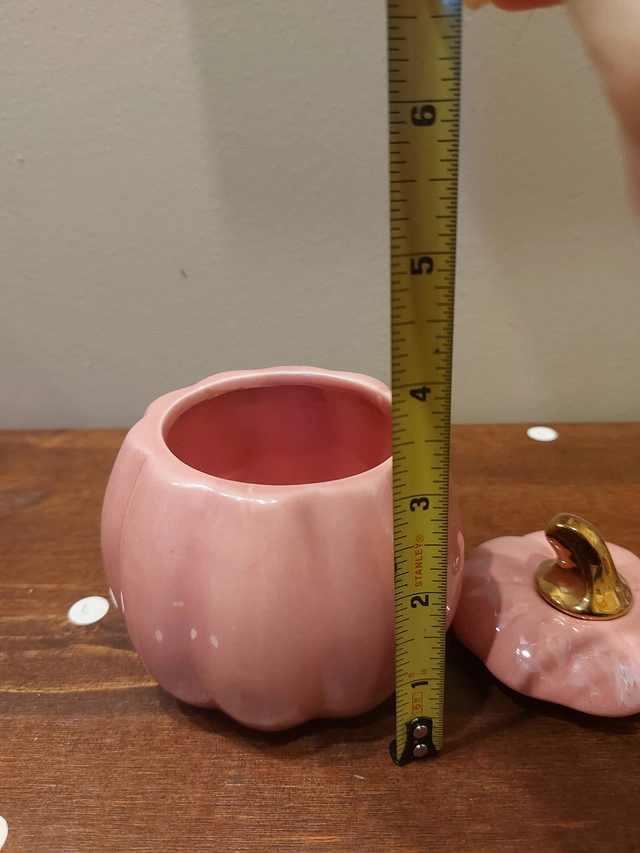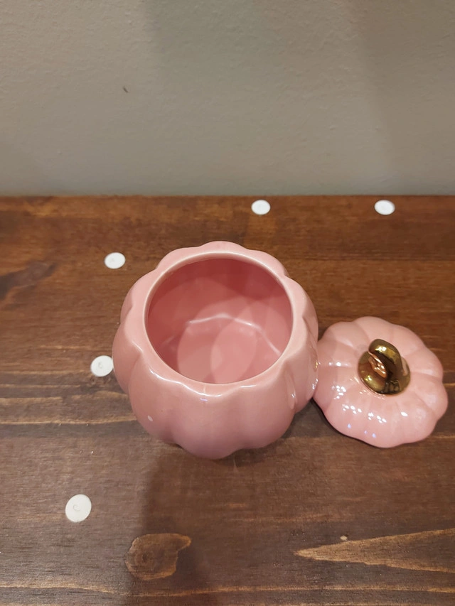 Super cute Charmed Aroma pink pumpkin candle holder from a past Autumn Collection. Holder only. I've cleaned out the majority of the original wax and had this on display, however, there may be some leftover inside. No chips or cracks that I could find. Candle holder glows beautifully with artificial flame tea lights or could be used as a planter or trinket holder! See photos for measurements.