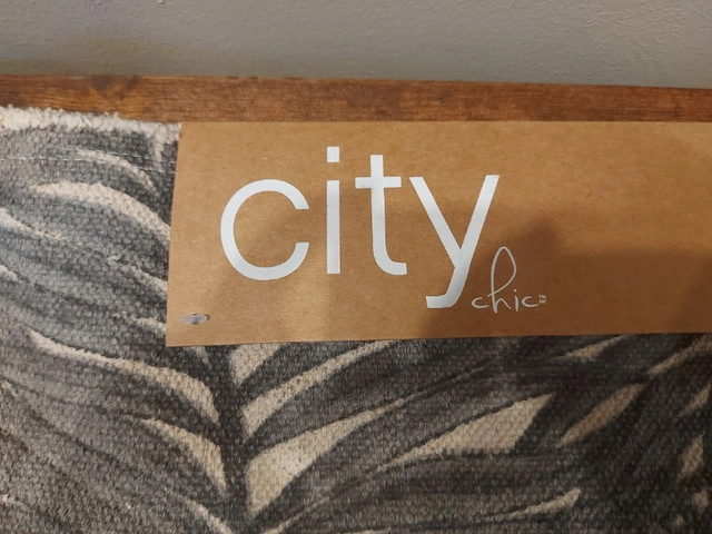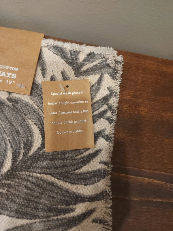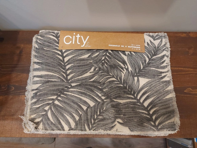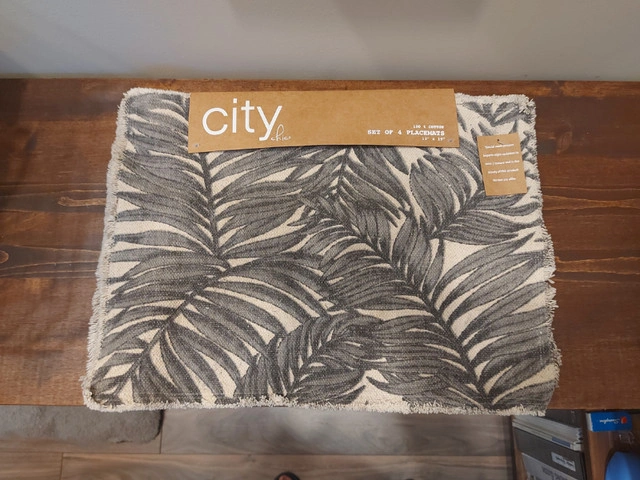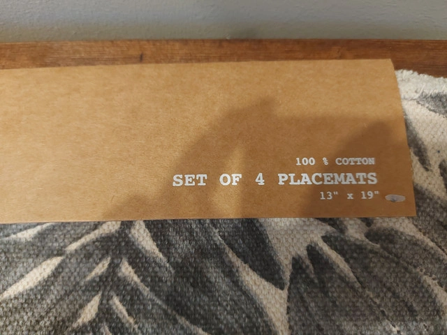 Brand new, never used, still attached together with original packaging. Set of 4 100% cotton placements. Cream and light gray/green color with Palm Tree inspired pattern. Each Mat Measures 13" x 19". Perfect for summer, picnic or beach outing! Machine washable, blank on reverse side. Pickup is in Dallas, Kamloops. FIRM Pricing