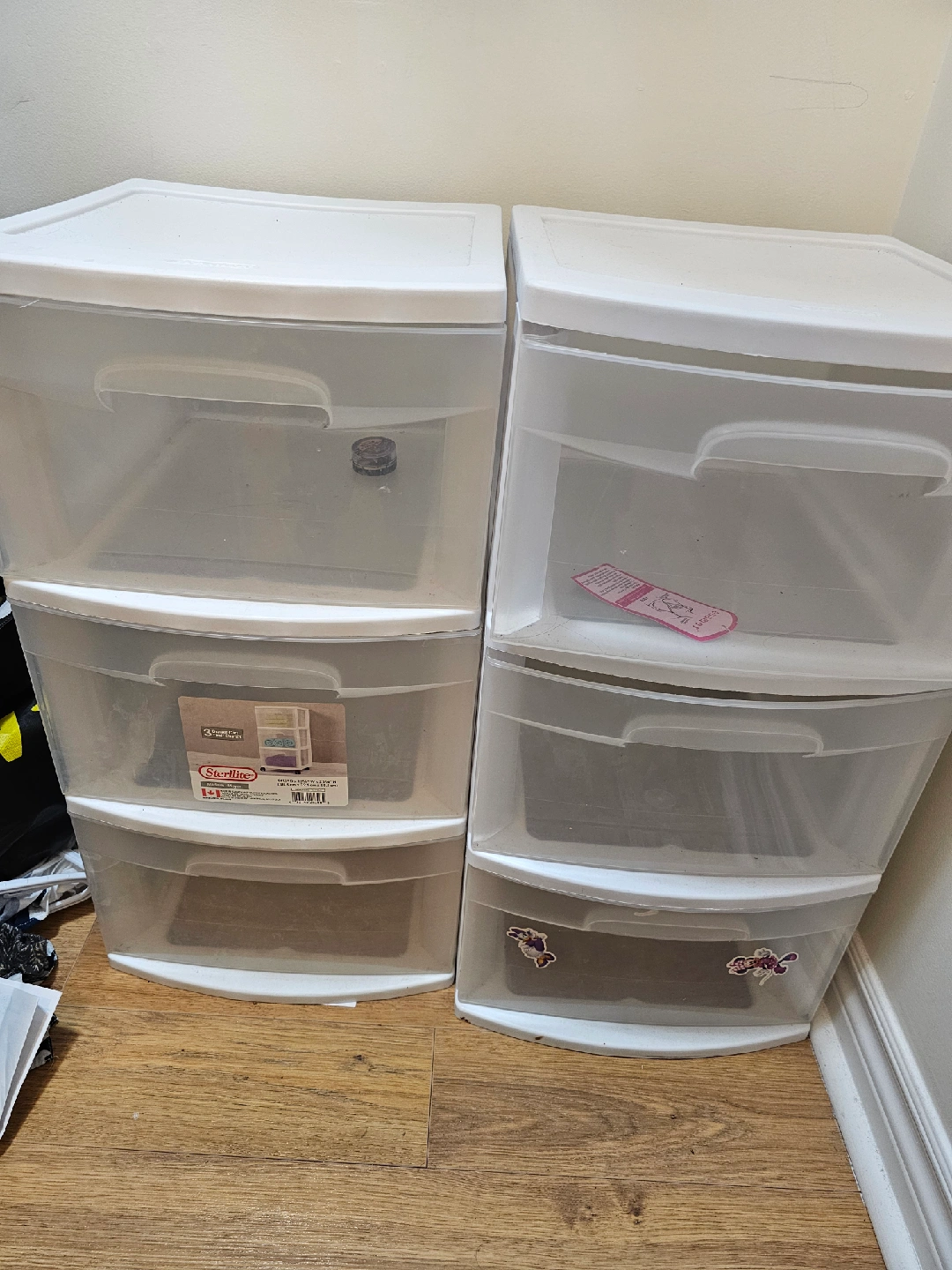 Selling two Sterilite 3-drawer wide weave towers. They're great for adding some extra storage space! One has a sticker on it.