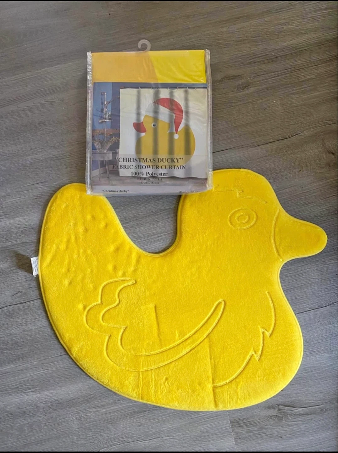 Get ready for the holidays with this adorable 'Christmas Ducky' shower curtain and bath mat set! The shower curtain is made of 100% polyester and measures 70 inches by 72 inches. The bath mat is a cute duck shape and is super soft. Add a festive touch to your bathroom this season!