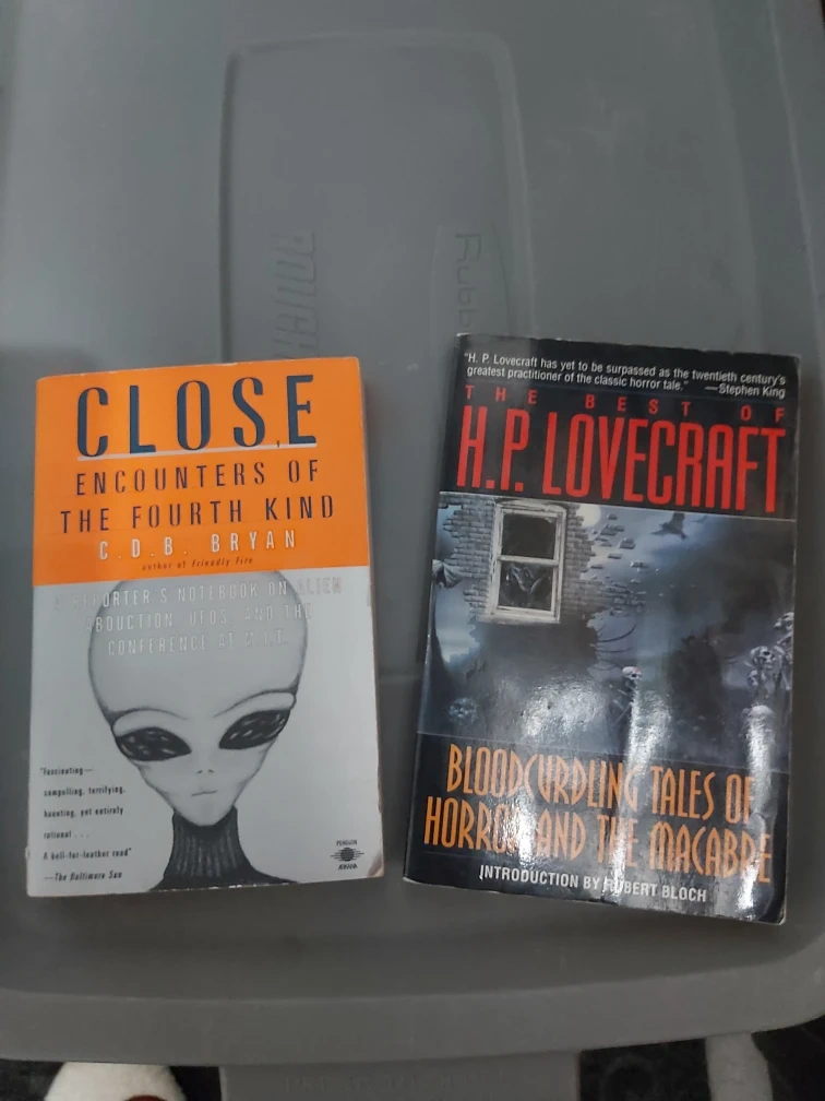 One is "Close Encounters of the Fourth Kind" by C.D.B. Bryan. The other is "The Best of H.P. Lovecraft: Bloodcurdling Tales of Horror and the Macabre". Both are in good condition and ready for a new home!
