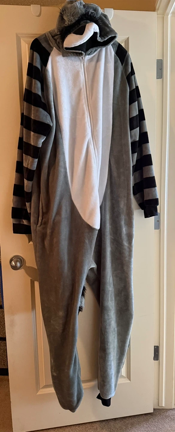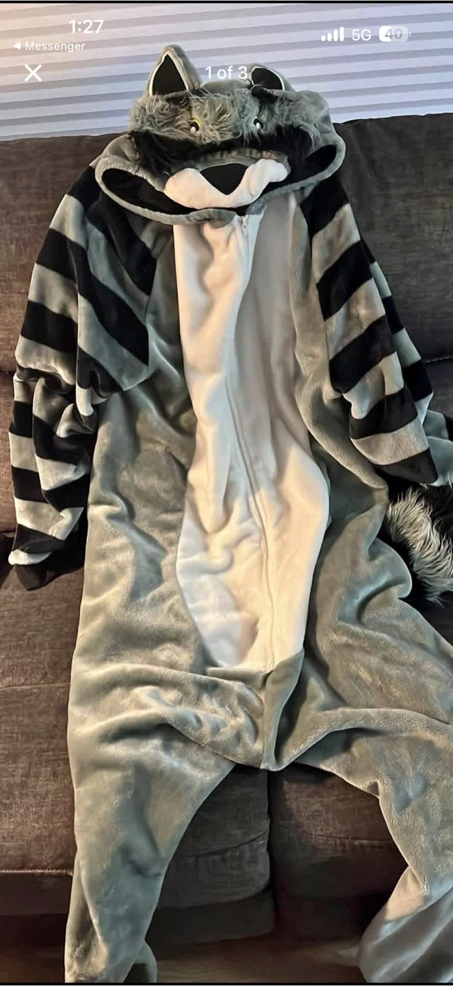 Selling a super cute adult raccoon funsie onesie! It's in great shape and would be perfect for lounging around the house or for a costume party. It's grey and black with a fluffy tail and hood with raccoon ears. So cozy and fun!