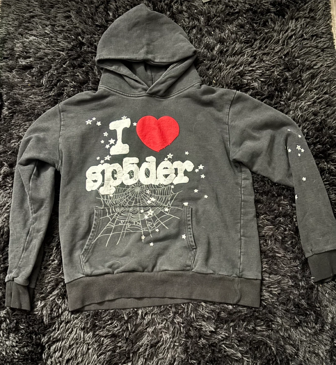 Selling a Sp5der hoodie in black with a red heart design! It's in great condition and features the iconic spiderweb graphic. A stylish and comfortable addition to any wardrobe