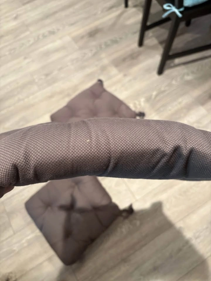 Set of four, dark gray, very comfy chair cushions with Velcro tabs to attach to chairs, some fading of the colors, but so much life left in these. 14x14