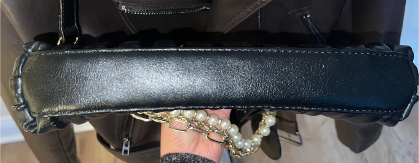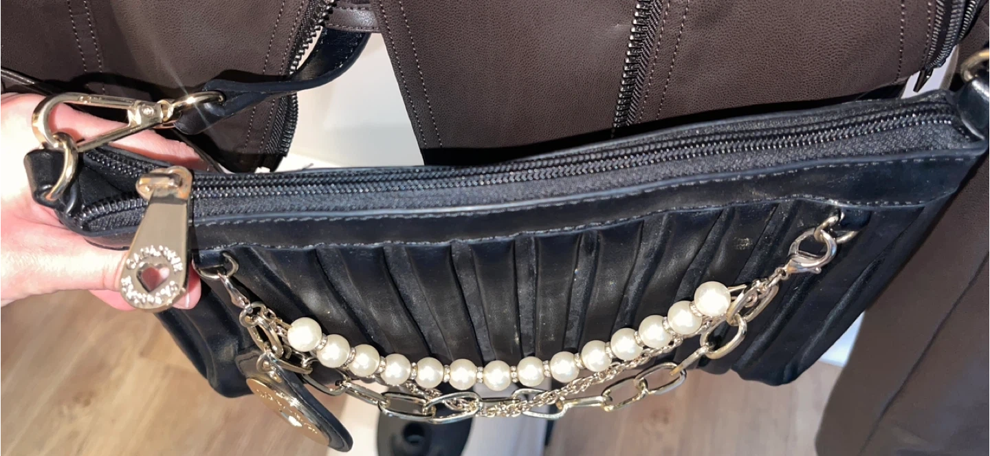 • Detachable/removable adjustable crossbody strap and front gold/pearl accessories