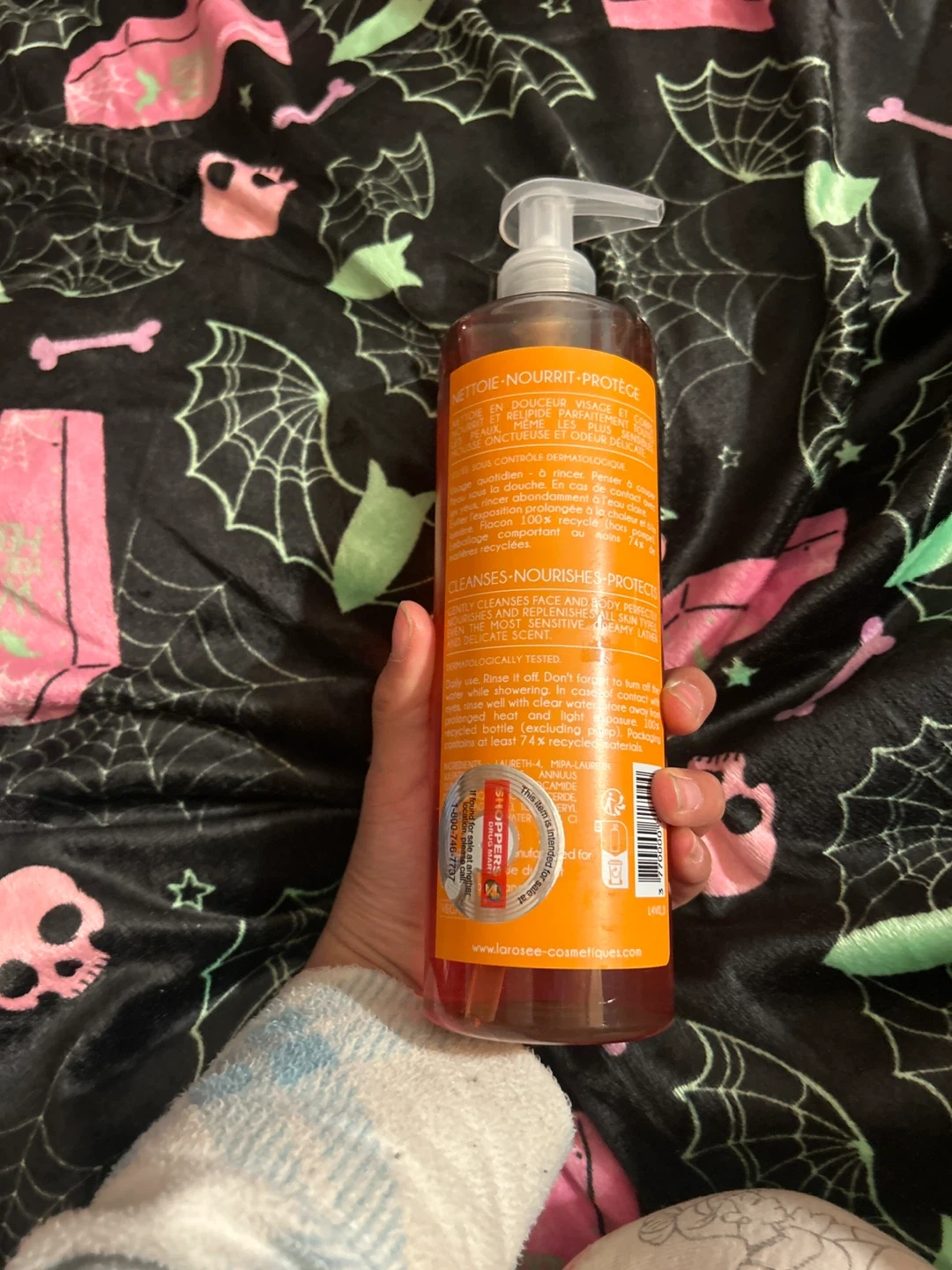 Selling a bottle of La Rose Paris cleansing shower oil. It's a cleansing shower oil with organic sunflower seed oil, suitable for all skin types. The bottle contains 400 ml / 13.52 fl oz