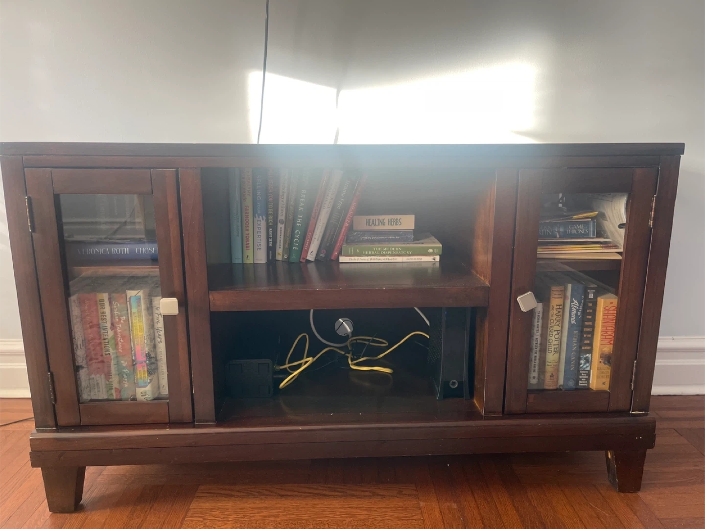 I'm selling a wooden TV stand. It has a dark finish and glass doors on either side. It's perfect for storing your media and displaying your TV. There is some wear and tear on the side.