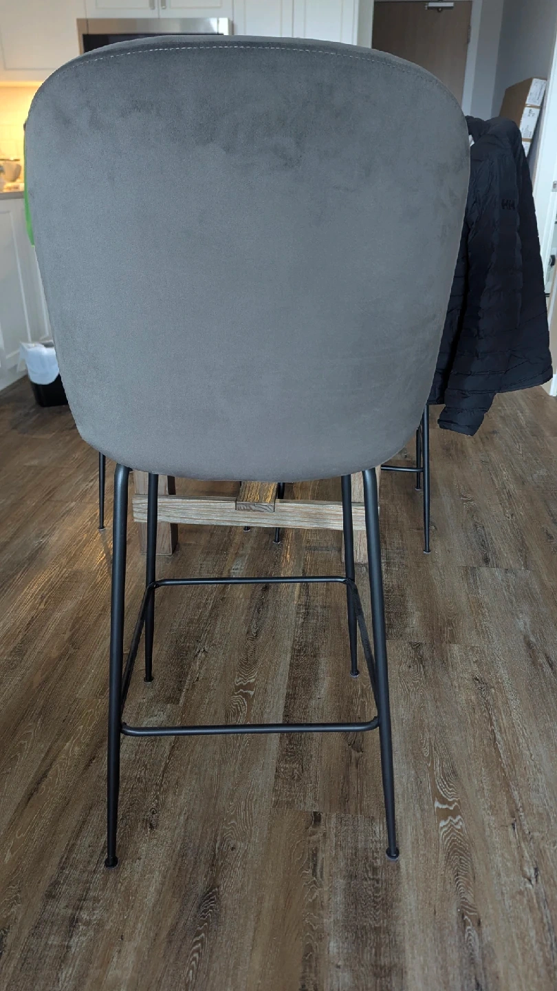 Selling 4 bar stools in great condition! It features a grey upholstered seat and backrest, paired with sleek black metal legs. Perfect for adding a modern touch to your kitchen or bar area