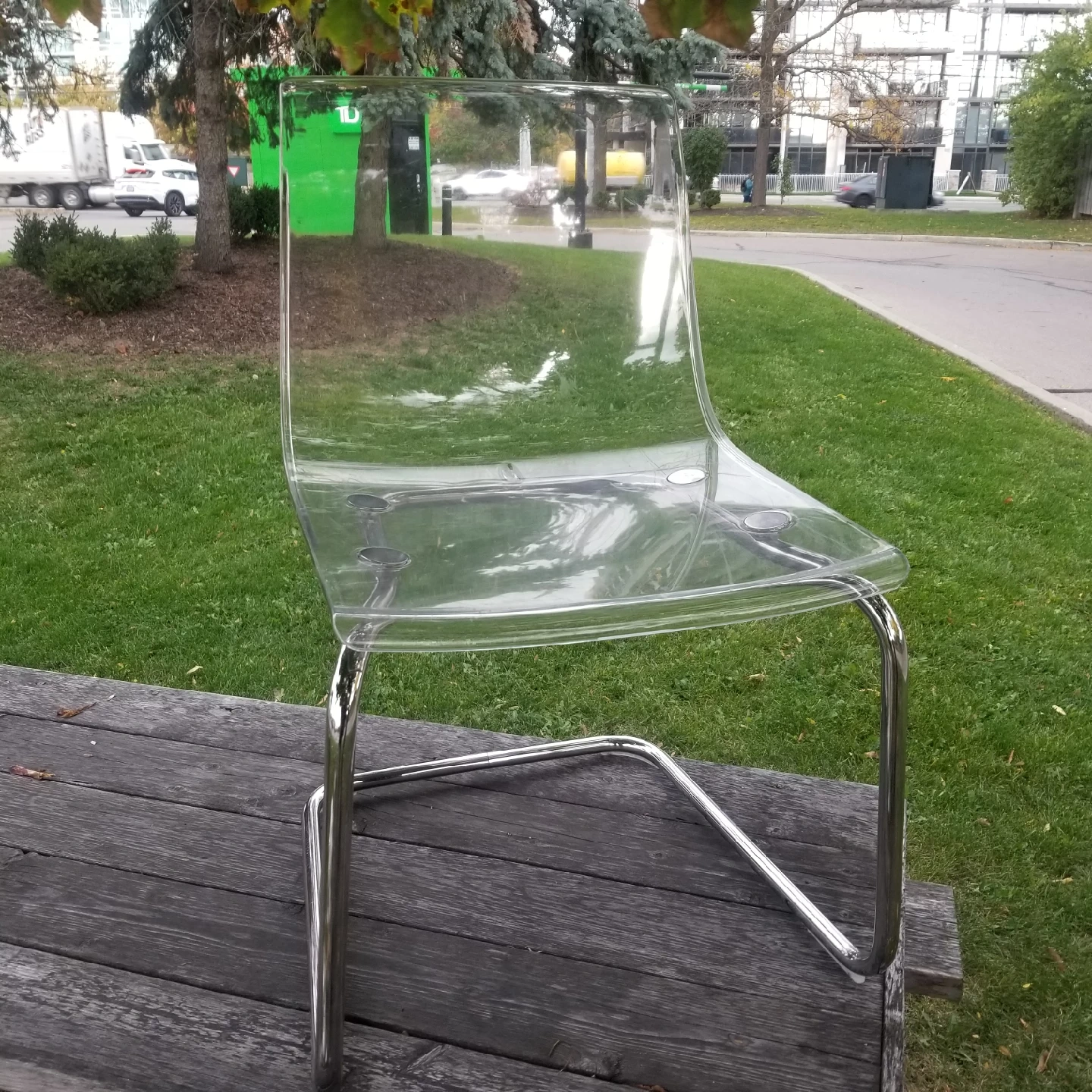 Selling a stylish clear acrylic dining chair with a chrome frame. It's in great condition and would be a cool addition to any dining room or office space. The transparent design gives it a modern and minimalist look!