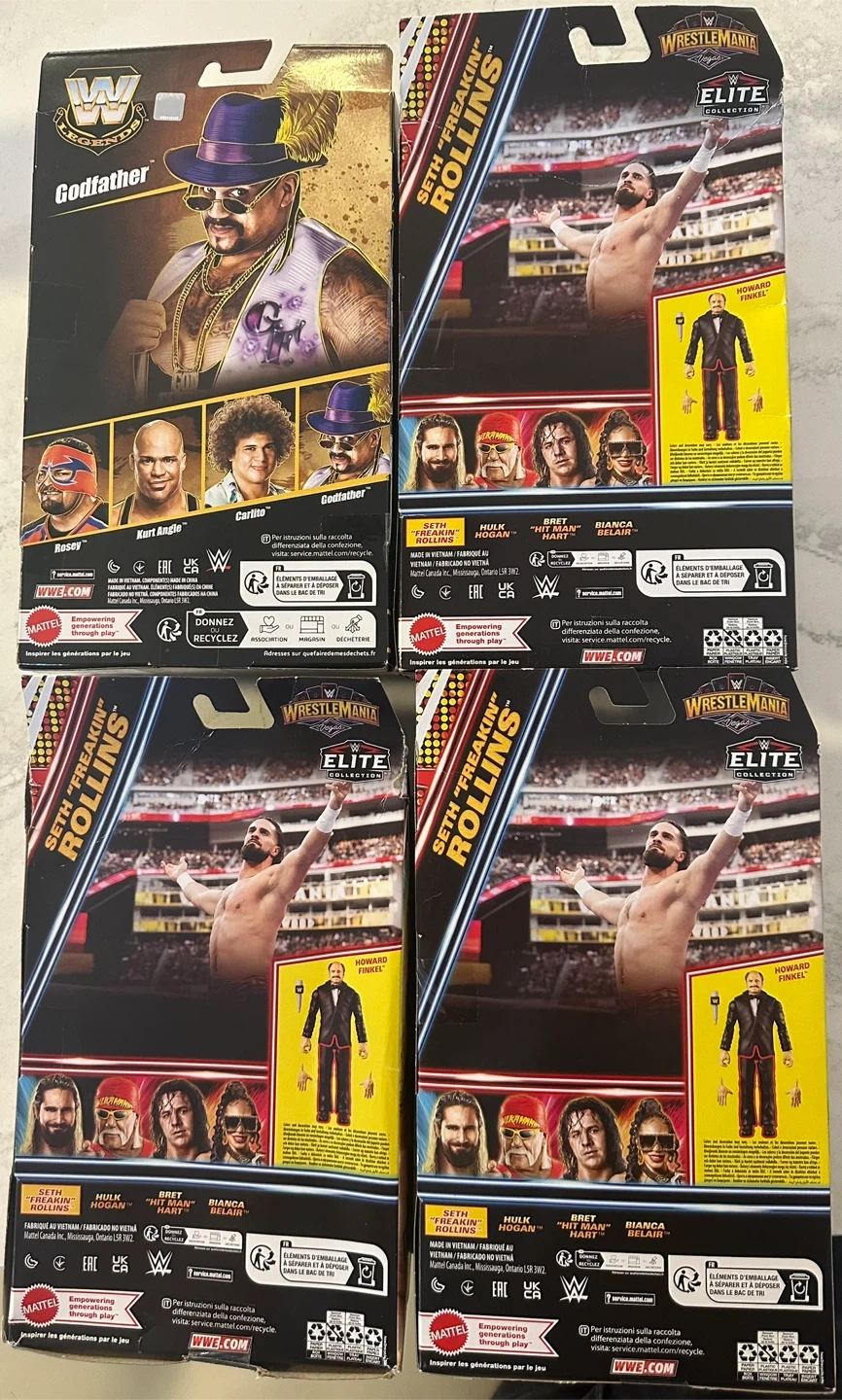 15Selling a set of WWE Elite Collection WrestleMania figures! Includes The Godfather and three Seth 'Freakin' Rollins figures. All are in their original packaging and in great condition. Perfect for any wrestling fan or collector!