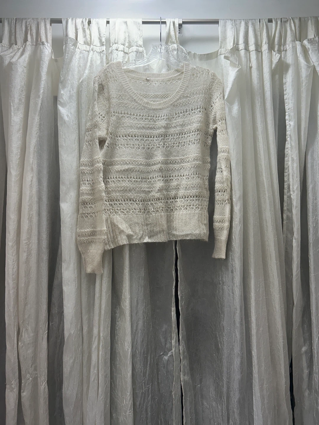 18Selling a cozy cream-coloured knit sweater! It's in great condition and perfect for layering during the cooler months. The knit pattern adds a touch of texture and style to any outfit