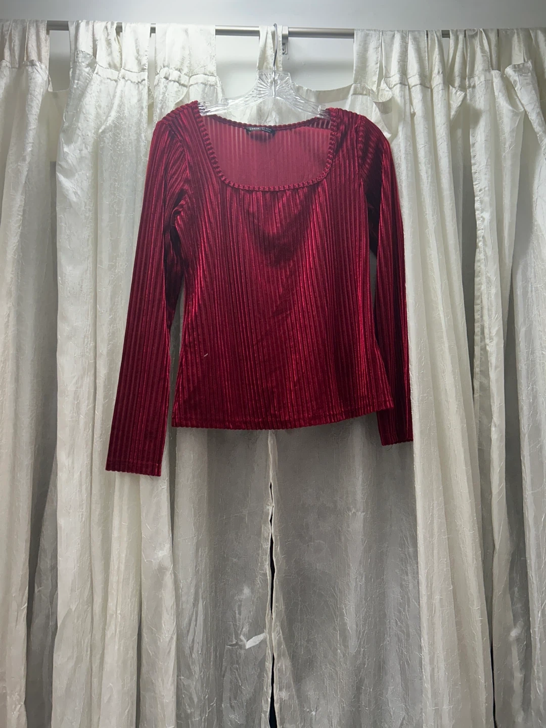 Selling a red velvet long sleeve top from SHEIN. It features a square neckline and a ribbed texture. Perfect for adding a touch of elegance to any outfit!