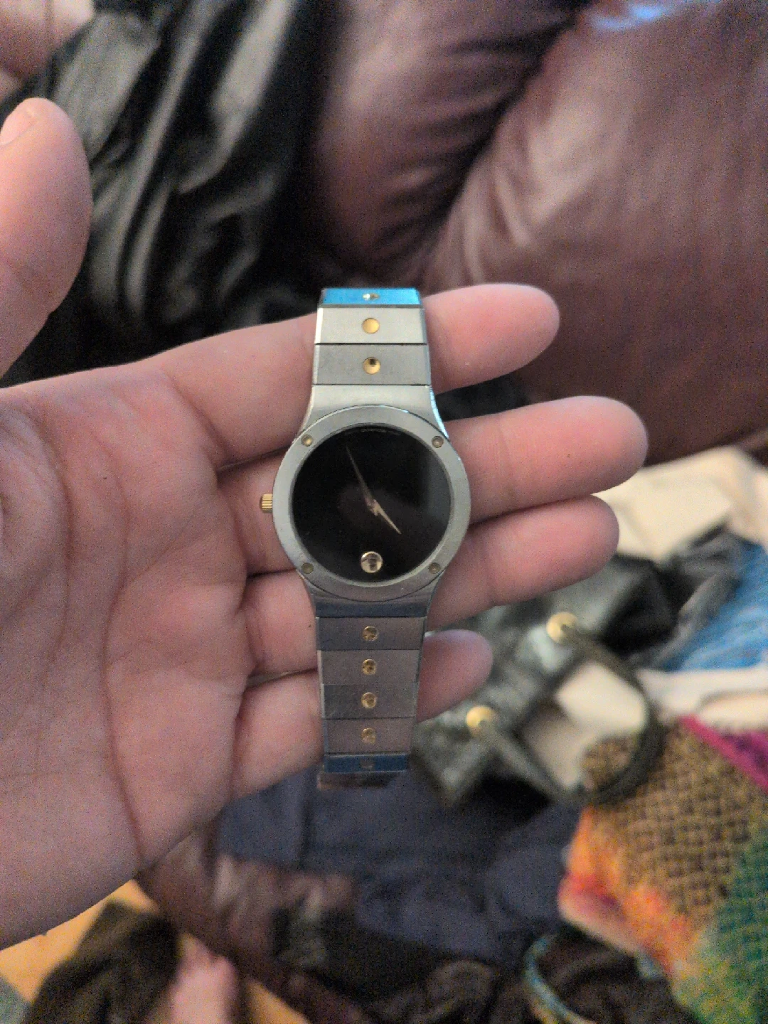 Selling a Movado watch. It has a silver band and a black face. It's in good condition and ready for a new home