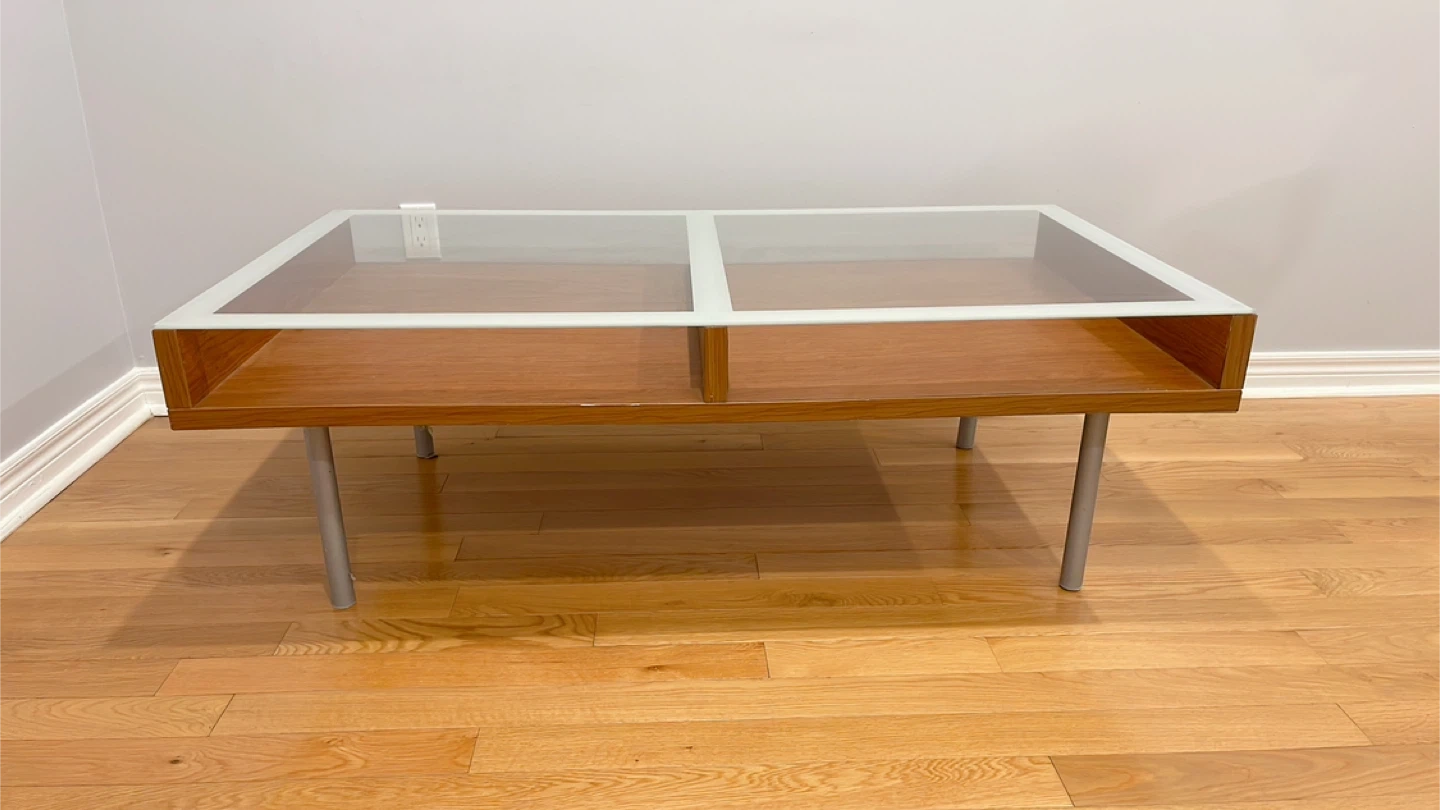 Selling a coffee table with a glass top and wooden frame! It features a sleek design with silver legs. Perfect for any living room space