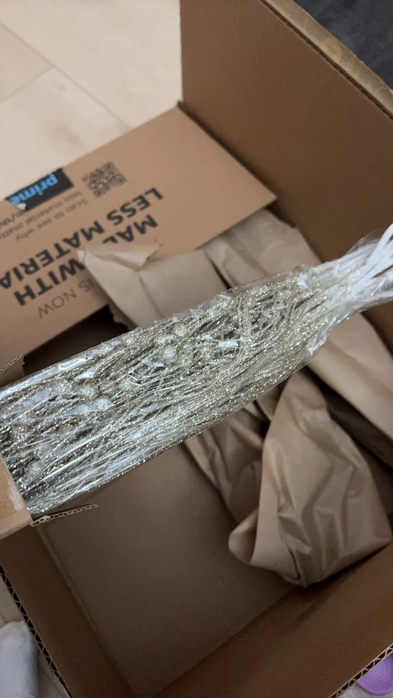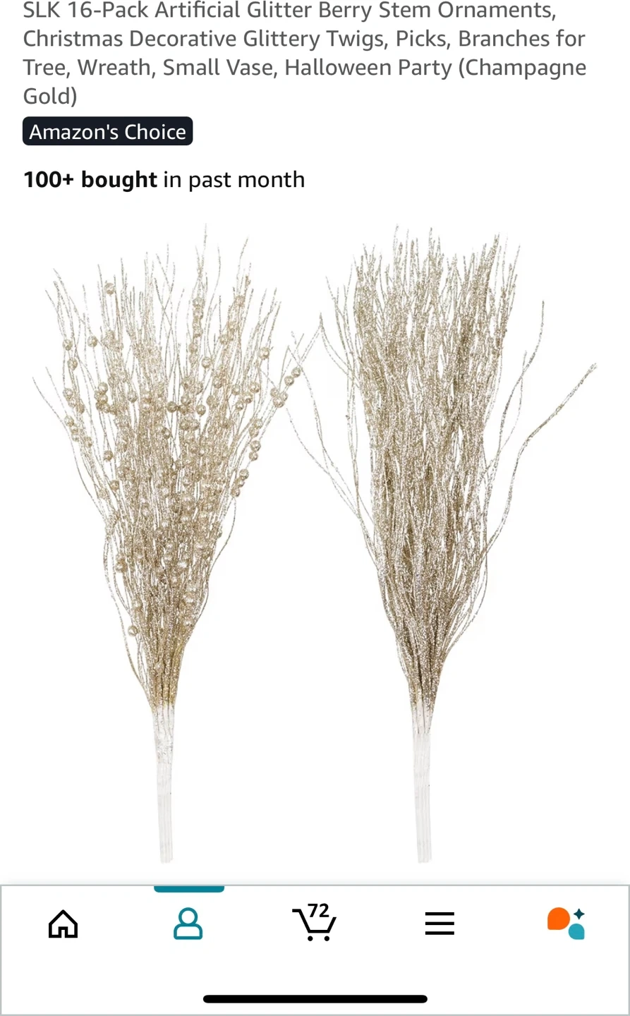62I'm selling a new, unopened pack of SLK 16-Pack Artificial Glitter Berry Stem Ornaments. These Christmas decorative glittery twigs, picks, and branches are perfect for a tree, wreath, small vase, or Halloween party. They come in a champagne gold color and include the original box