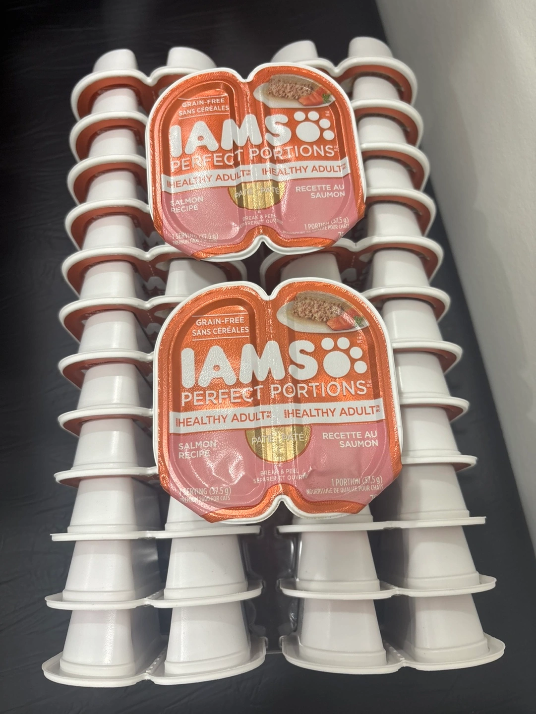 102I'm selling QTY 26 of Iams Perfect Portions Healthy Adult Salmon Recipe cat food. They are grain-free and come in pate form. The expiration date is 2027 January 05. BEST OFFER PICKUP ONLY CASH ONLY