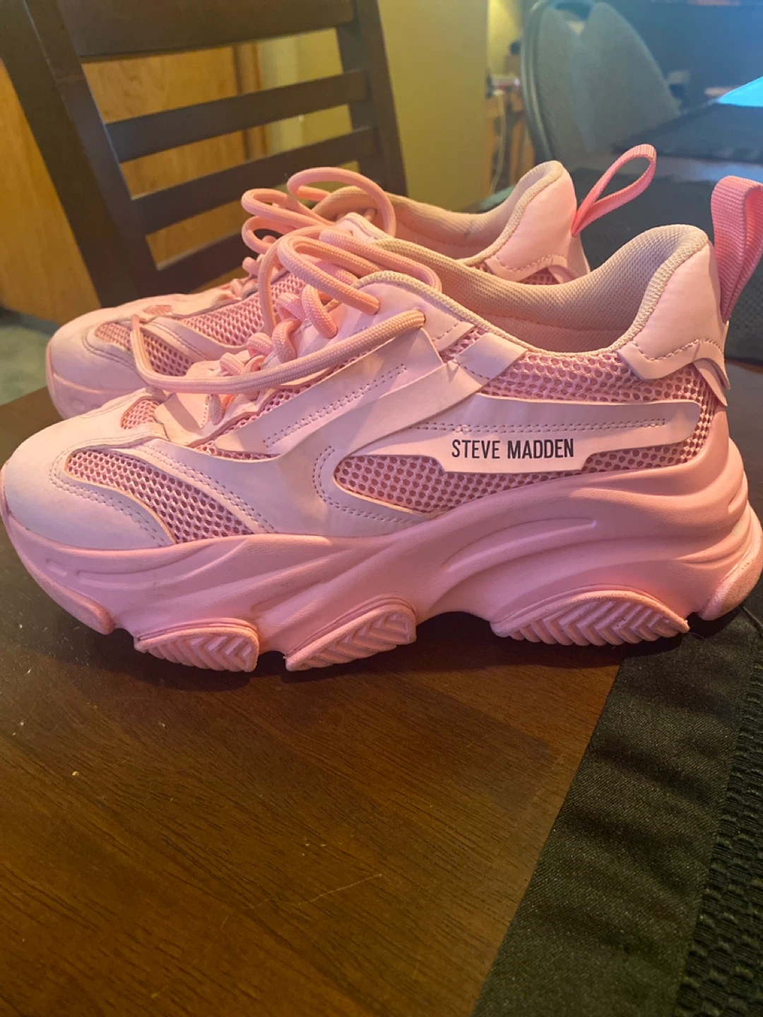 Selling a pair of Steve Madden chunky sneakers in pink. They show some signs of wear, as you can see in the photos, but still have lots of life left!