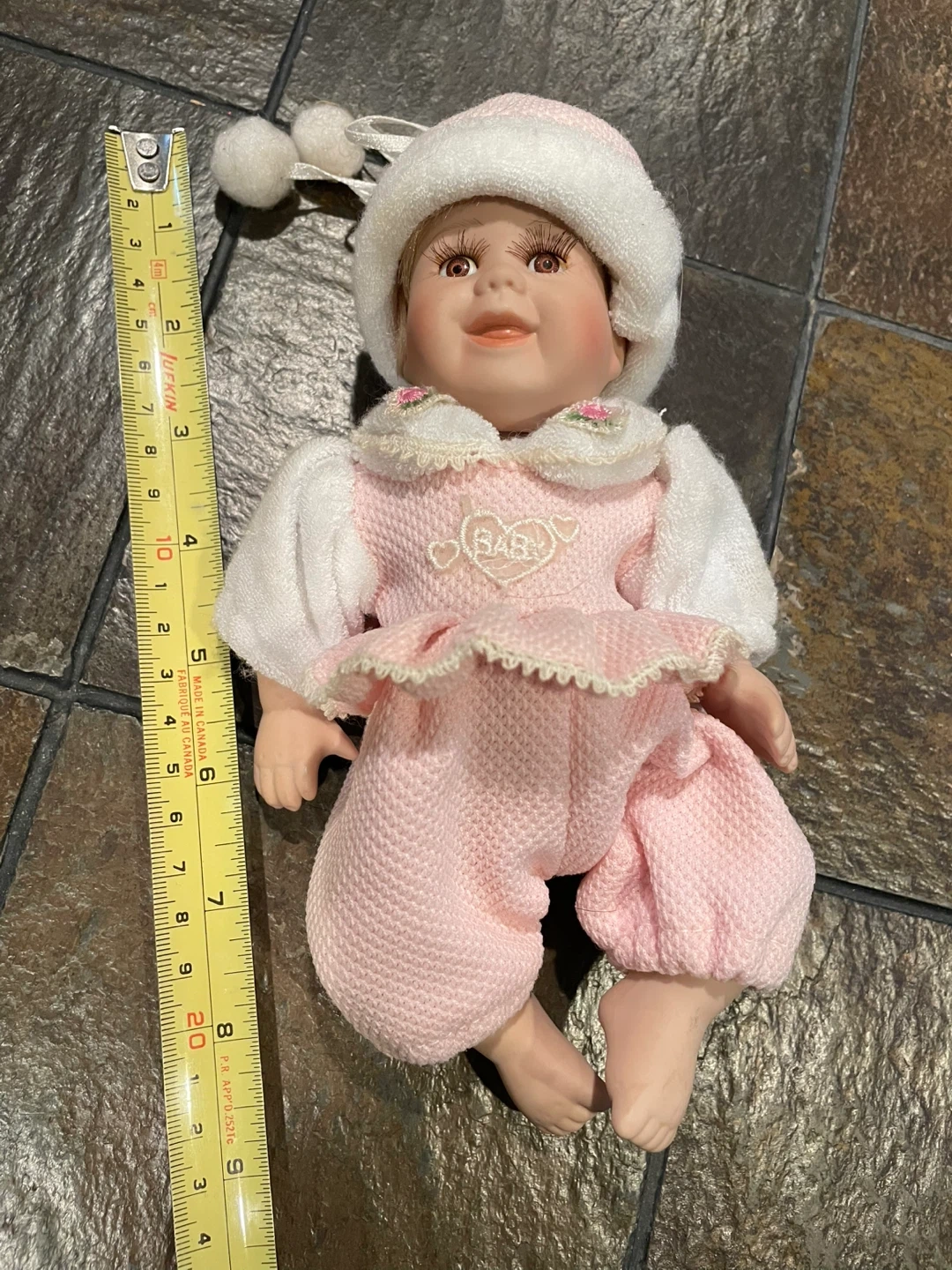 This adorable porcelain baby doll is looking for a new home! She's wearing a sweet pink and white outfit. Perfect for collectors or as a charming decorative piece