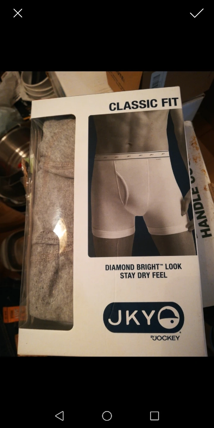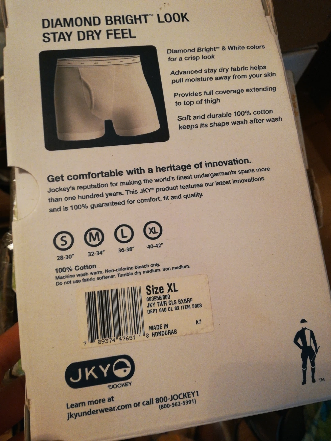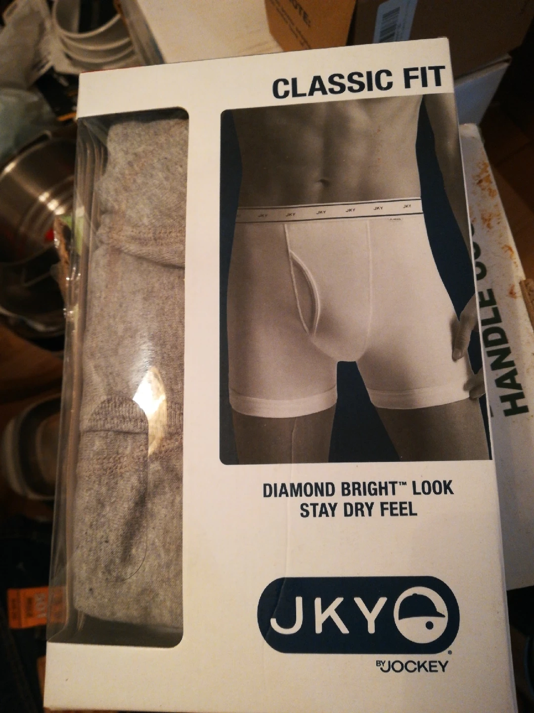 Selling a new pair of JKY by Jockey Classic Fit boxer briefs, size XL (40-42). These are made with Diamond Bright & White colors for a crisp look and advanced stay-dry fabric to help pull moisture away from your skin. They provide full coverage extending to the top of the thigh and are soft and durable 100% cotton, keeping their shape wash after wash