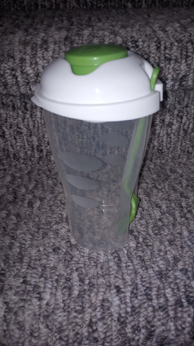 Salad container with a white lid and clear container. It has a green container for dressing, and fork. Perfect for taking your own salad on the go!