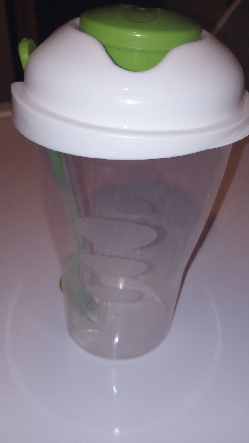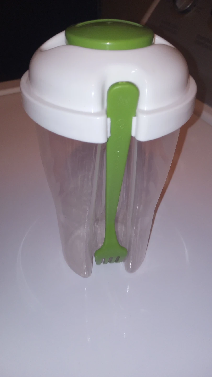 Salad container with a white lid and clear container. It has a green container for dressing, and fork. Perfect for taking your own salad on the go!