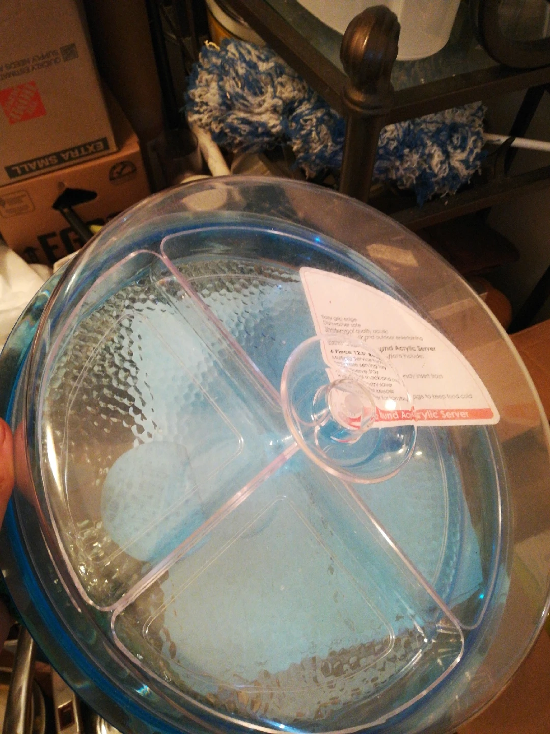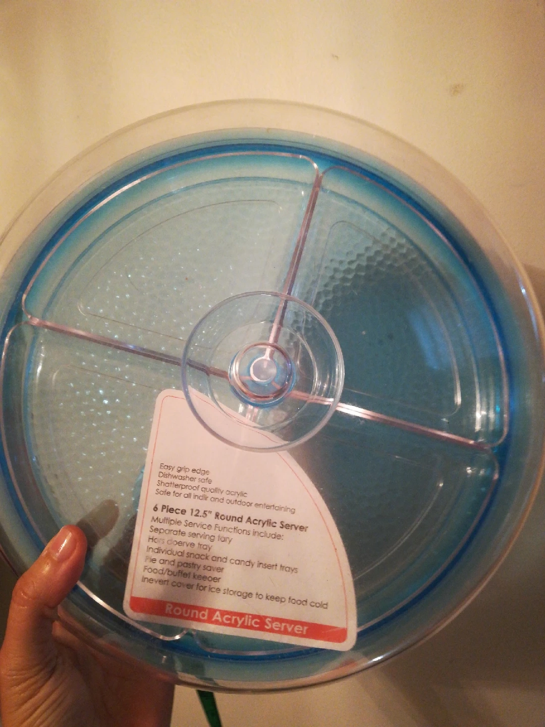 This is a 6 piece 12.5" round acrylic server. It has multiple service functions, including a separate serving tray, hot or serve tray, individual snack and candy insert trays, and a food or buffet keeper. It also has an invert cover to keep food cold. There is also a 19oz tumbler.
