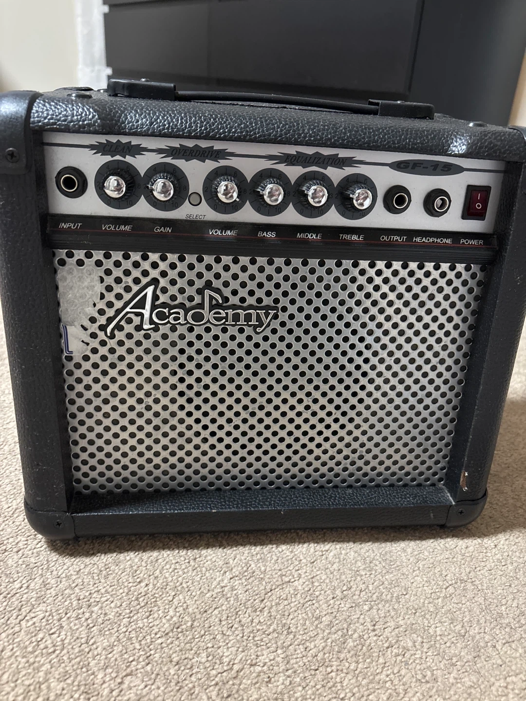 Selling an Academy GF-15 guitar amplifier. It's in good condition and ready to rock! Perfect for practice or small gigs. It features volume, gain, bass, middle, and treble controls to dial in your sound. There's also a headphone output for quiet practice.