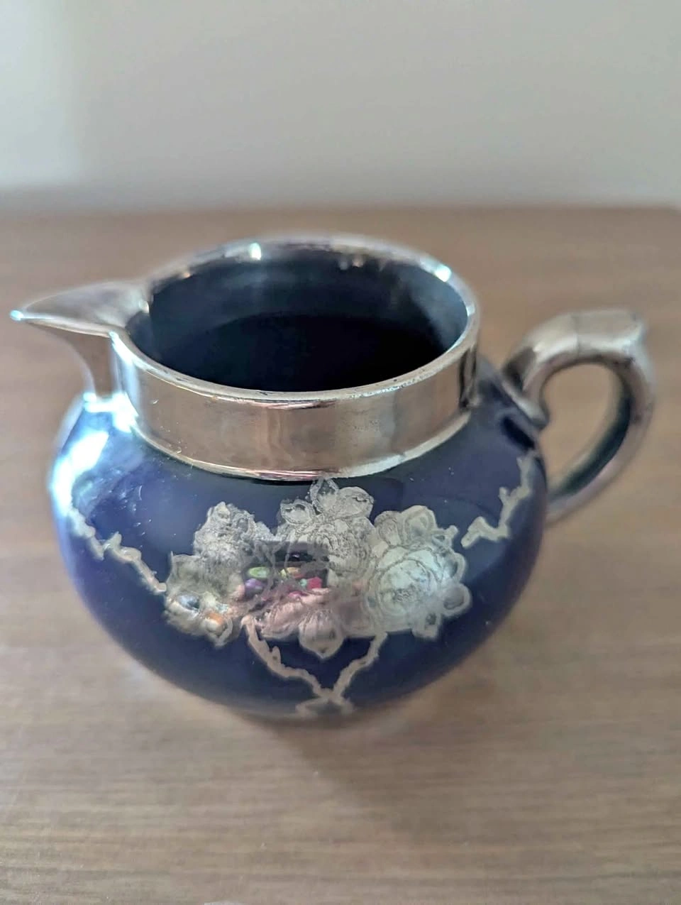 Vintage Silver Over Cobalt Blue Creamer Pitcher 3” Tall