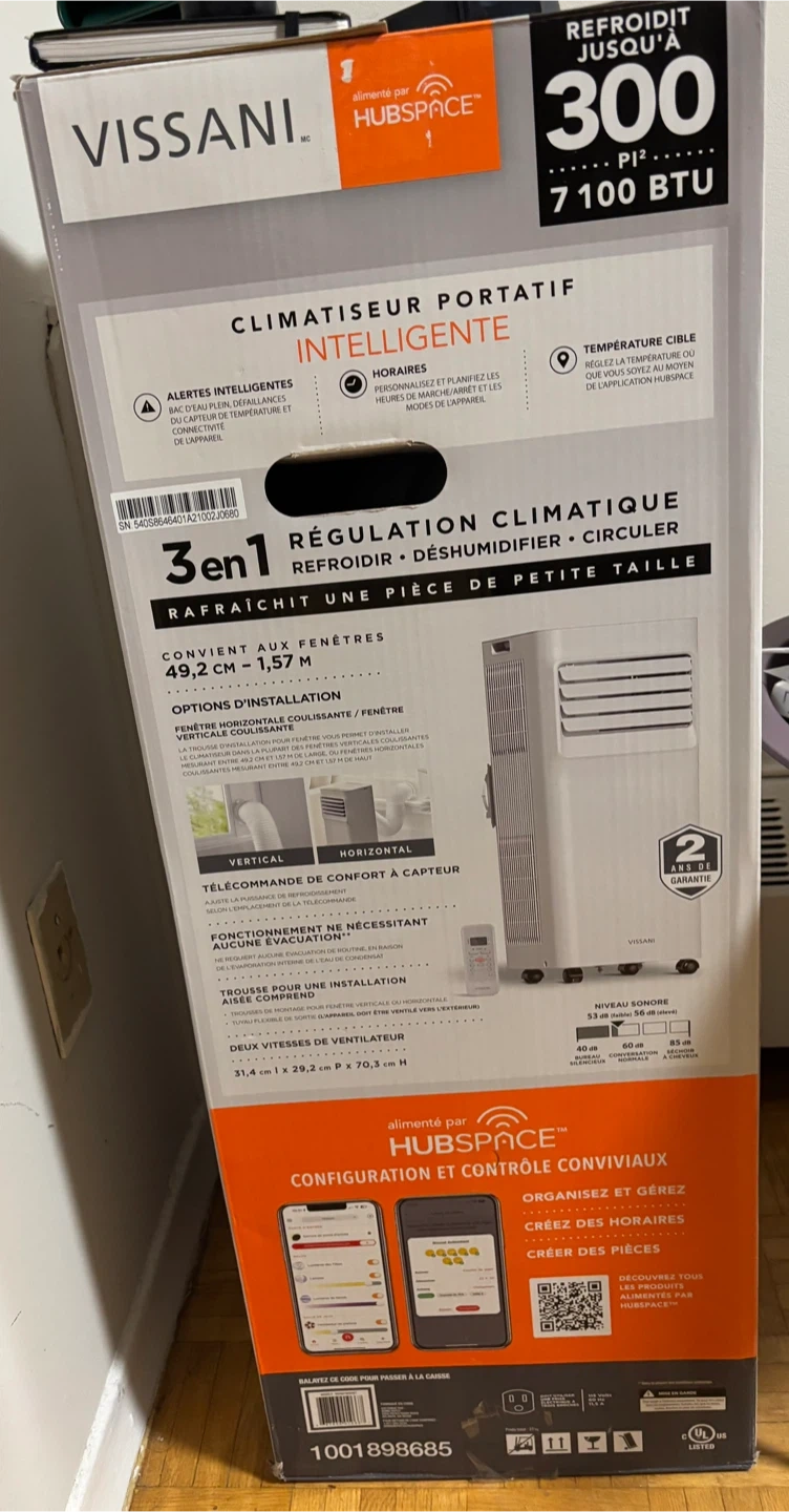 Selling a Vissani MC portable air conditioner in excellent condition! It's a 3-in-1 unit that can cool, dehumidify, and circulate air. It's suitable for small rooms, with dimensions of 49.2 cm to 1.57 m. It has a climate control regulation and can be installed vertically or horizontally. The box is included! A working remote is not included