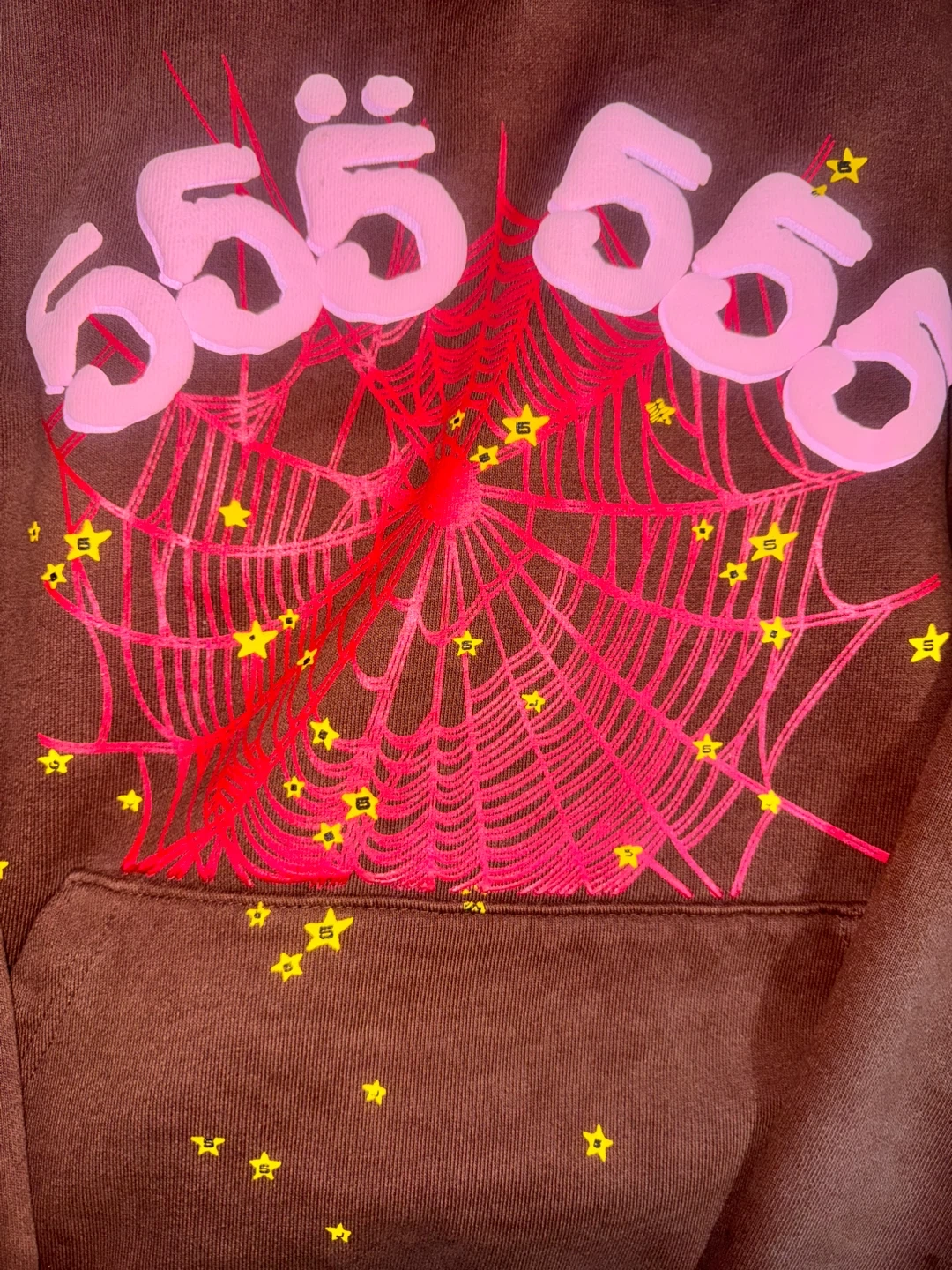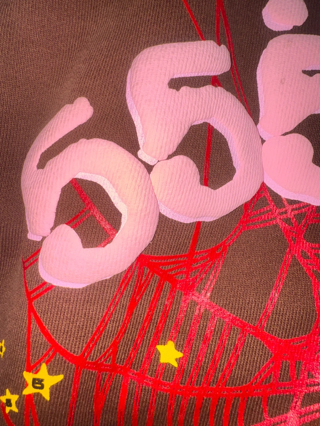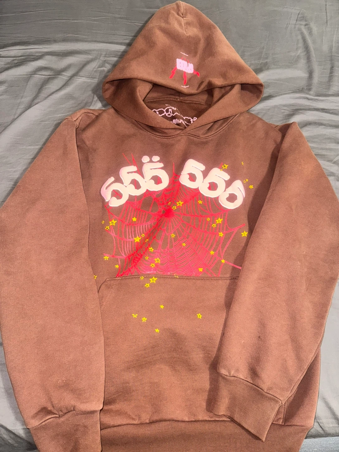 Selling a brown 555 Sp5der hoodie in size medium. The hoodie features a unique design with the Sp5der logo and a spiderweb graphic. It's a stylish and comfortable piece!