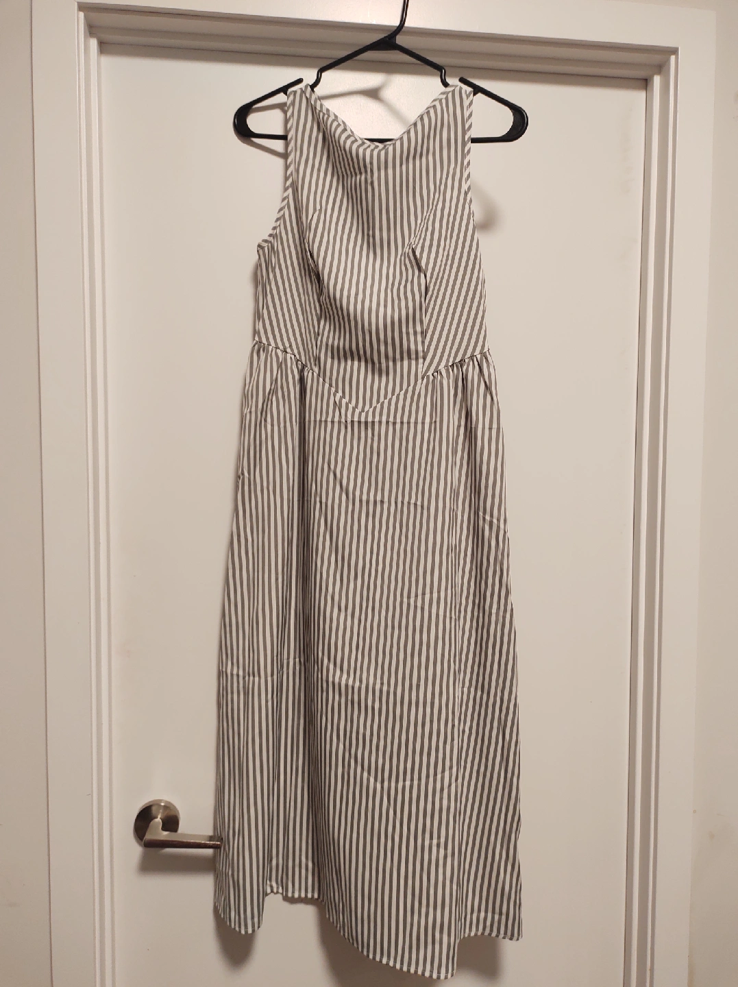 Selling a cute striped sleeveless midi dress! It's in great condition and perfect for summer. The dress features a flattering silhouette and comfortable fabric. It would be a great addition to your wardrobe for casual outings or dressier occasions.
